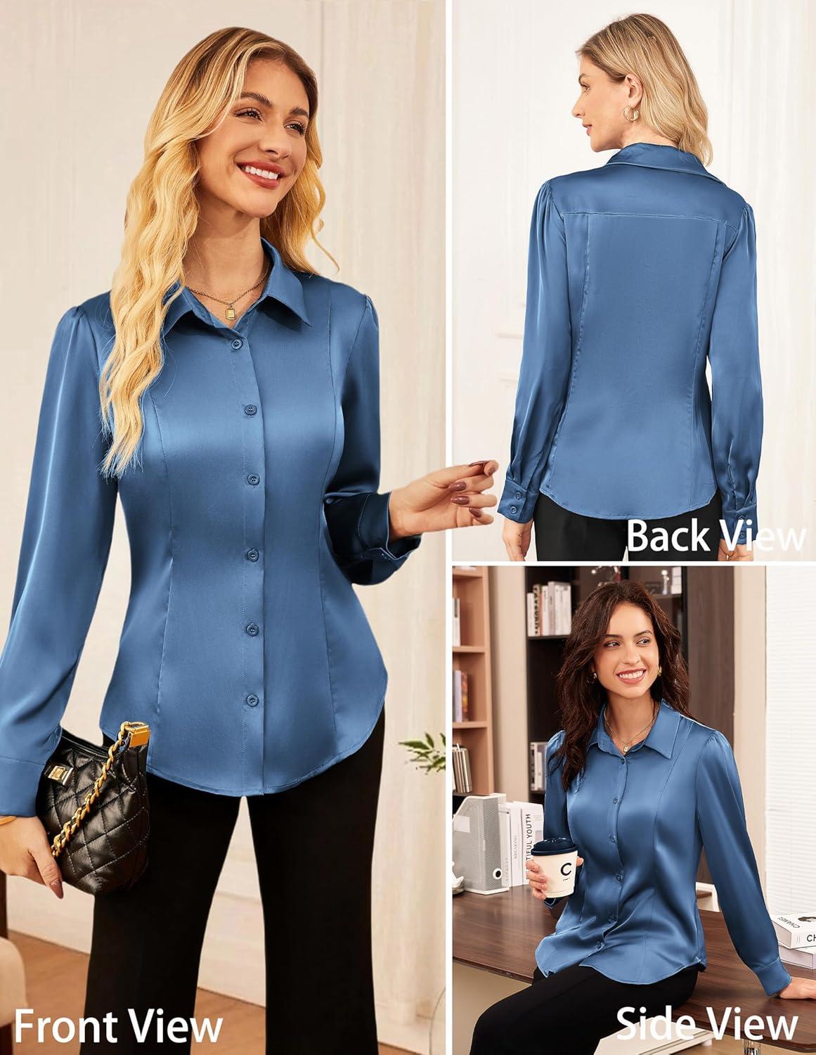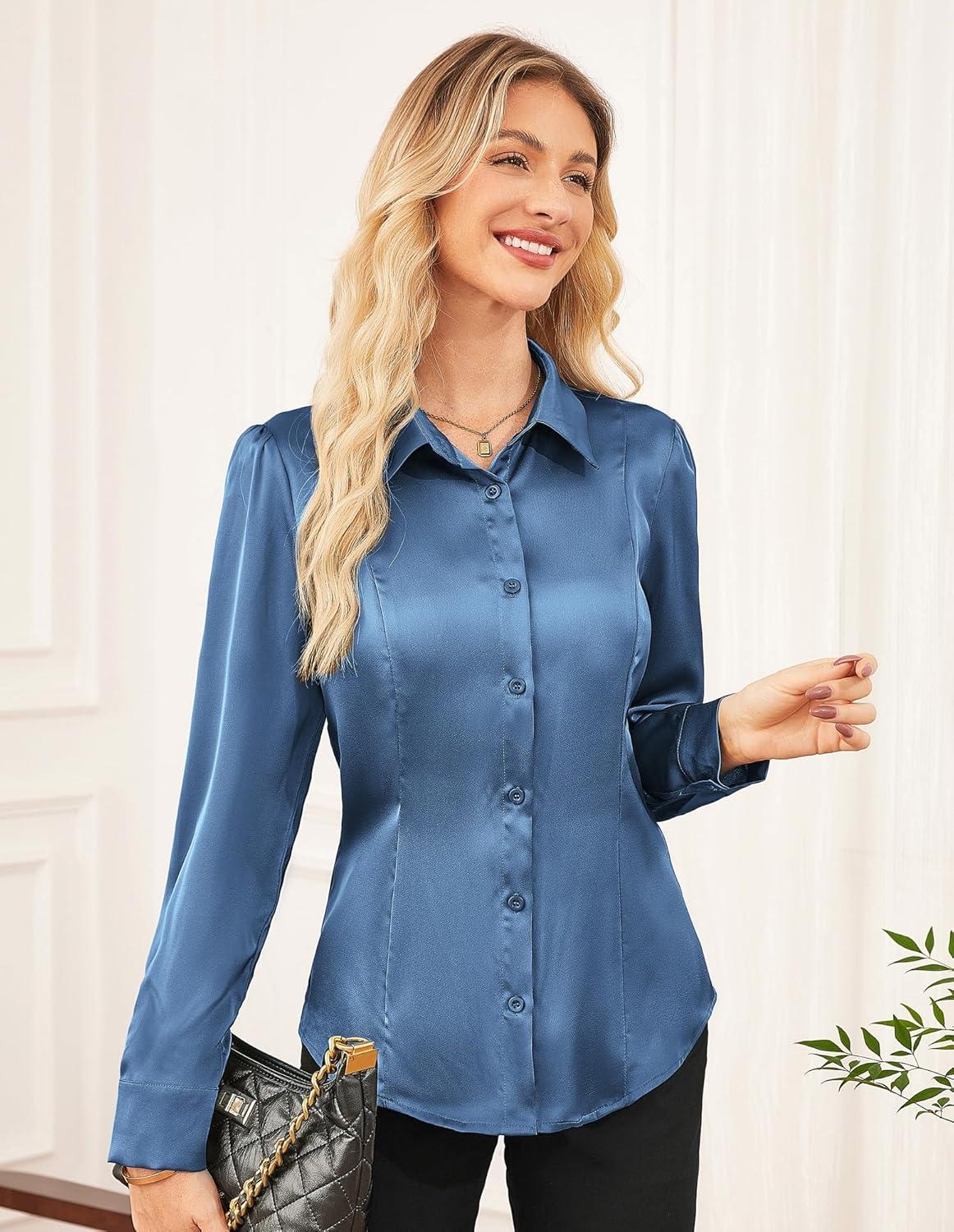 GRACE KARIN Satin Blouses for Women, Long Sleeve Business Shirt, Work Dressy Casual Tops, Professional Office Outfit(Blue)