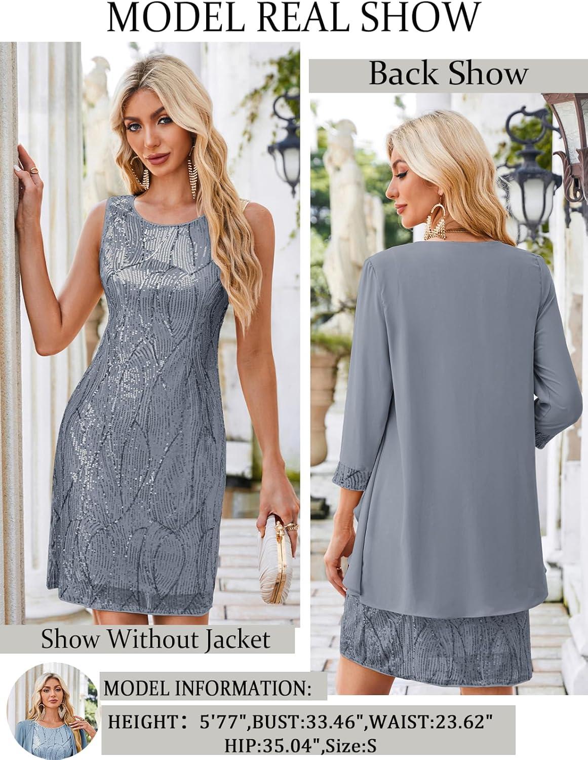 GRACE KARIN Sequin Dress for Women Knee Length Mother of the Bride Dresses Formal Dress Two Piece Dress with Chiffon Jacket(Dark Gray)