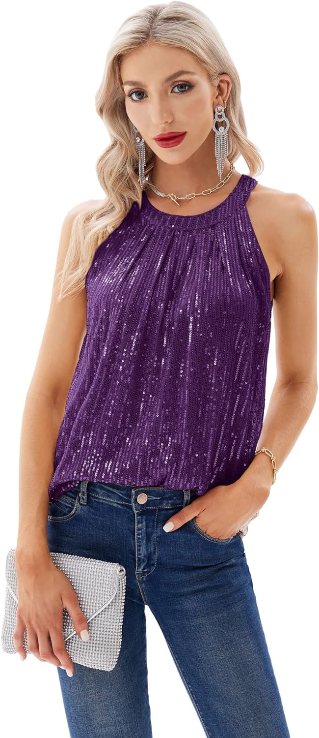 GRACE KARIN Sequin Halter Tops for Women Sleeveless Dressy Sparkle Tank Camisole Tops Party Club Cocktail Vest Shirt(Purple)
