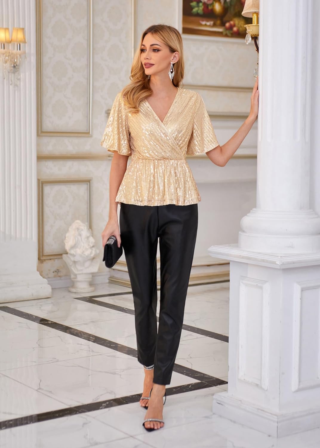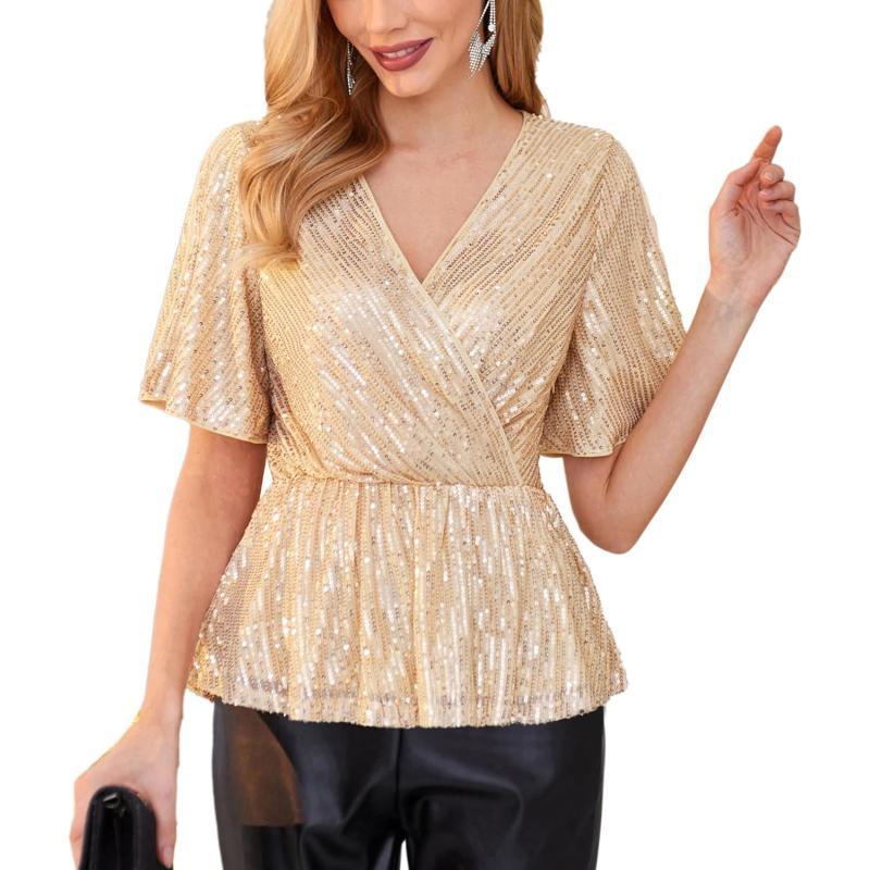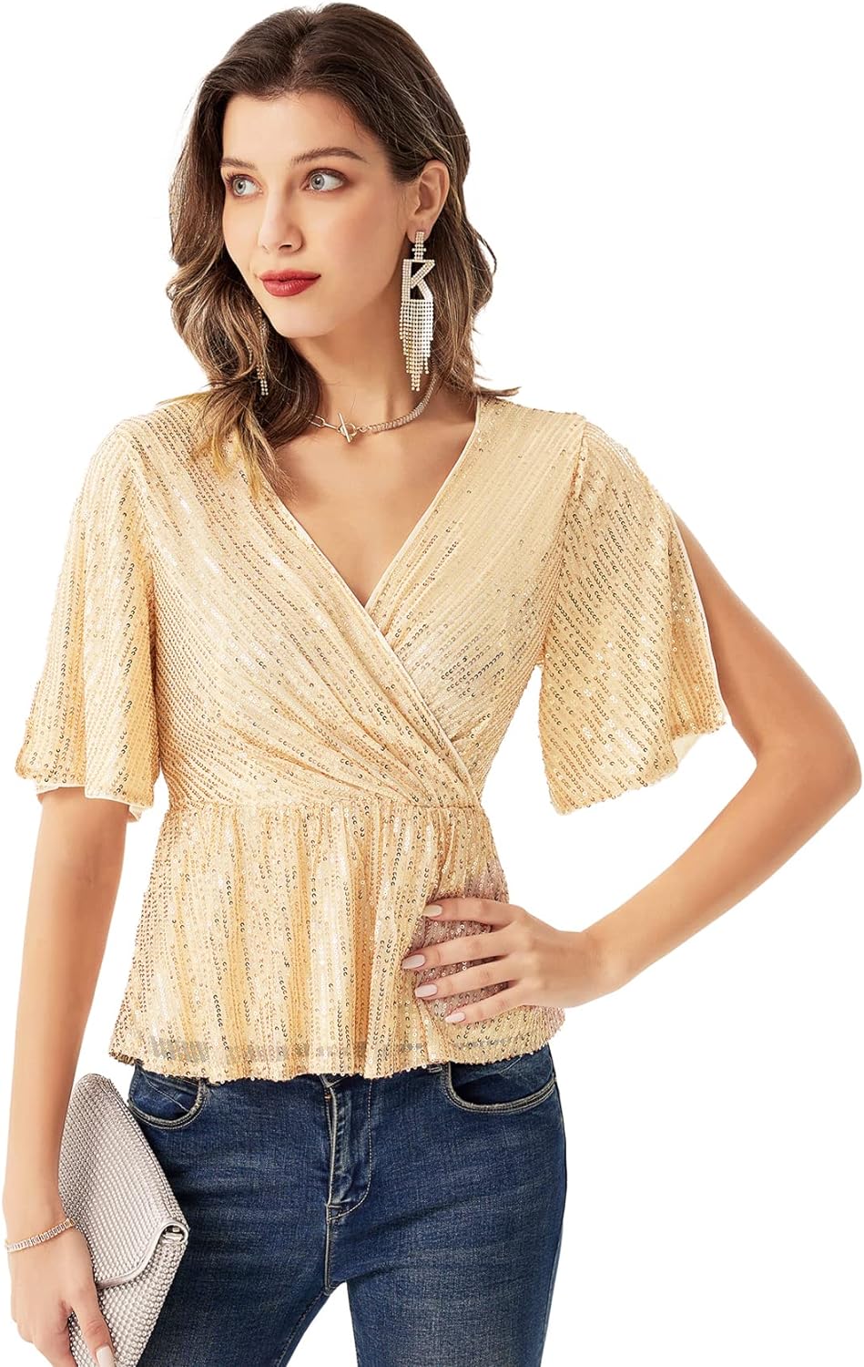 【Fashion Trend】Sexy club sparkly top, sequin tops make you stand out from the crowd. V neck wrap tops, ruffle sleeve blouse, fashionable glitter sequin t shirt, slim fit blouse, ruched tops can improve the feminine charms and show your perfect figure.
