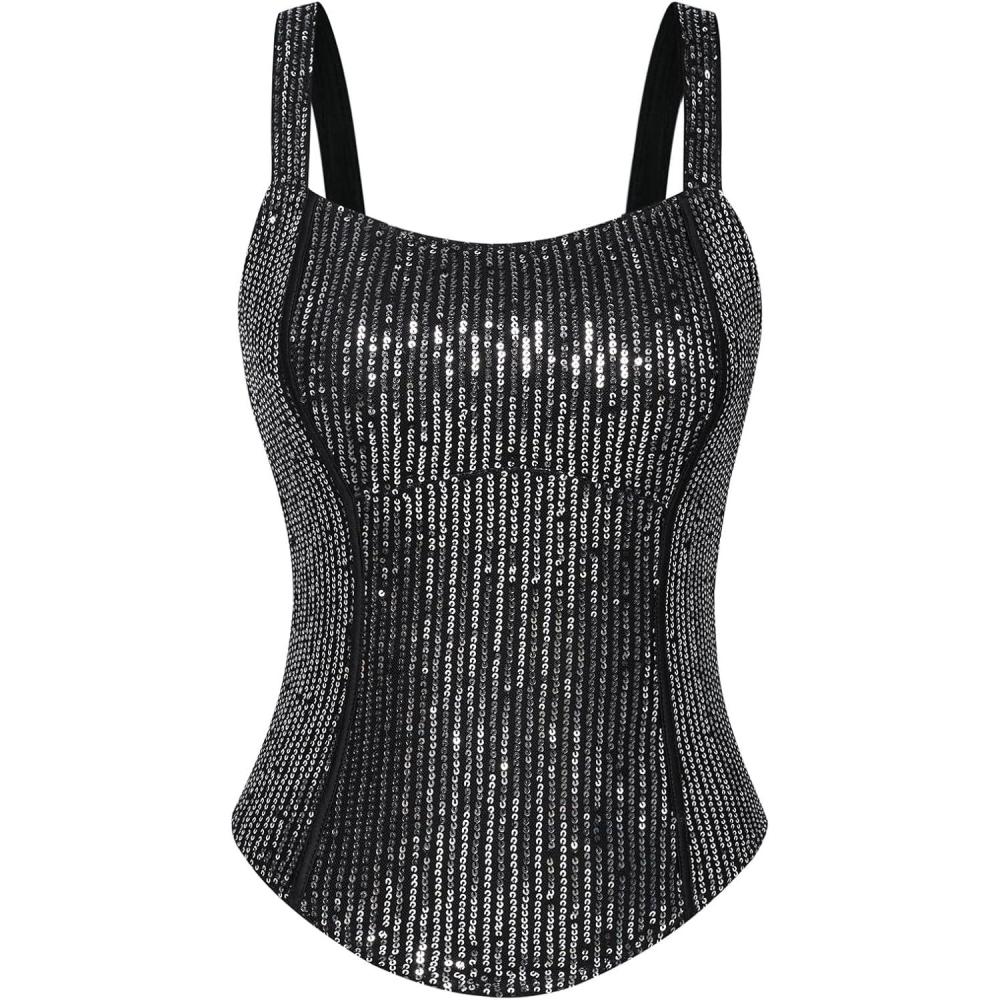 imageGRACE KARIN Sequin Tank Tops for Women Bustier Corset Top Sparkle Sexy Slim Camisole Sleeveless PartyBlack Silver