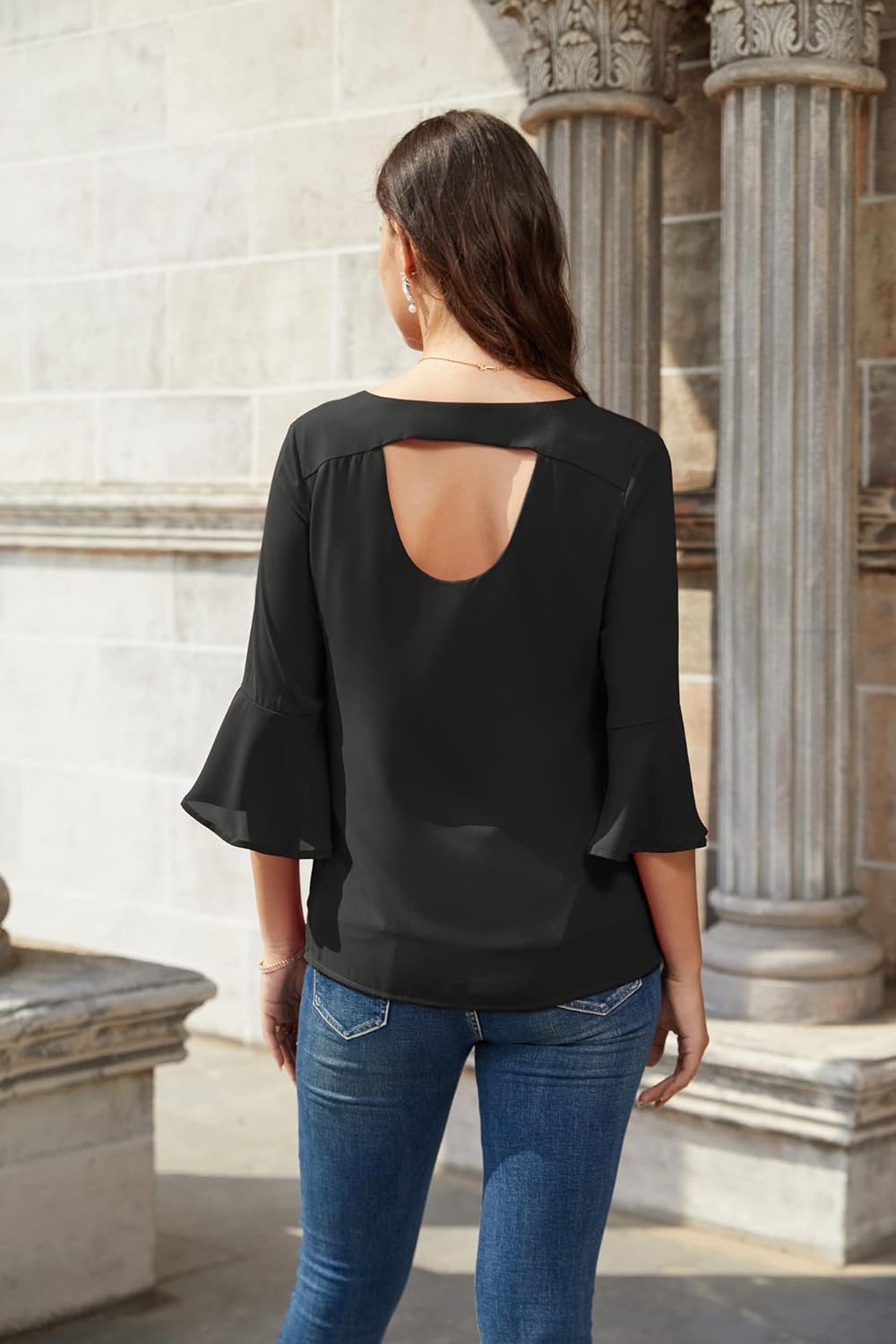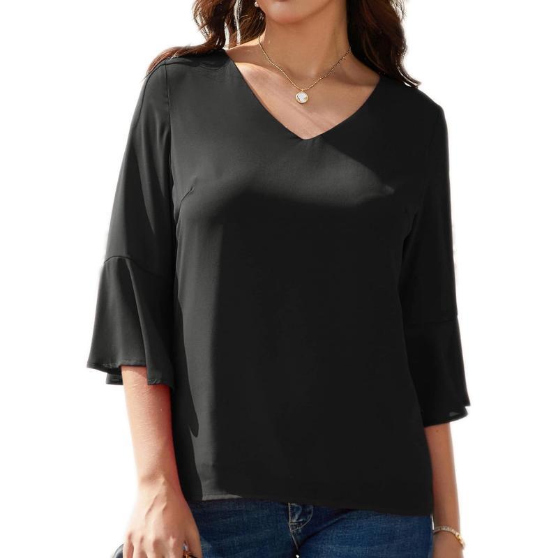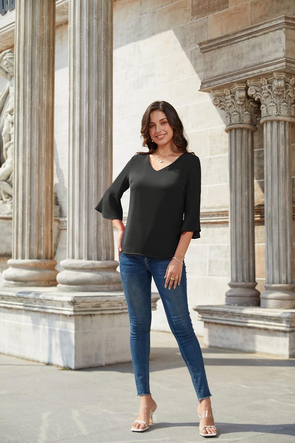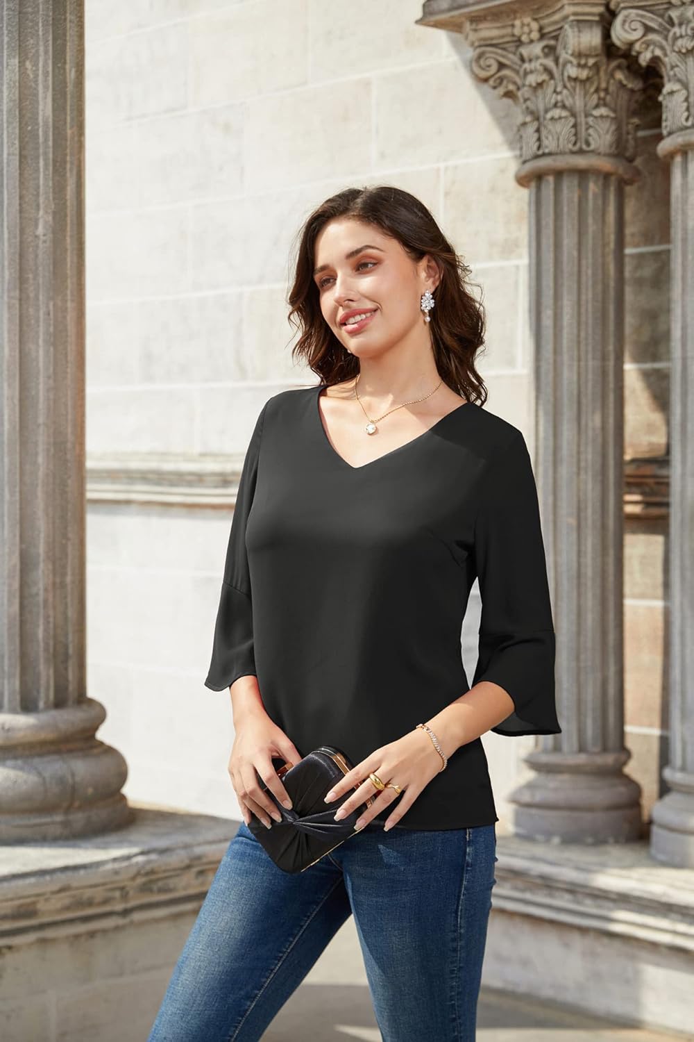GRACE KARIN Sequin Tops for Women 34 Bell Sleeve VNeck CutOut Shiny Metallic Sparkly Glitter Party Tops BlouseSolid Black