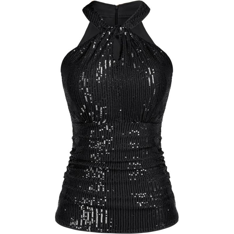 GRACE KARIN Sequin Tops for Women Elegant Halter Tops Sparkle Tank Shimmer Party Club Cocktail Slim Fit Ruched TopsBlack