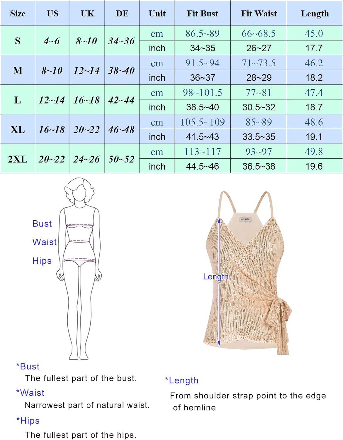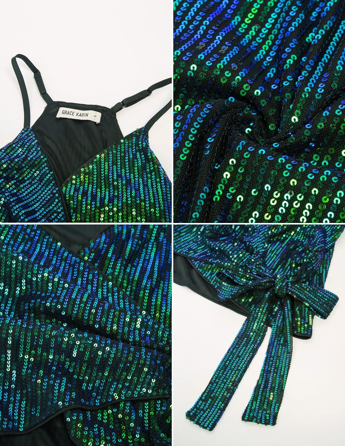 【Grace Karin Sequin Top】Sequin top, wrap v neck, elegant ruched, sexy sleeveless, adjustable spaghetti strap, slim fit, with full lining, elastic fabric, tie waist.