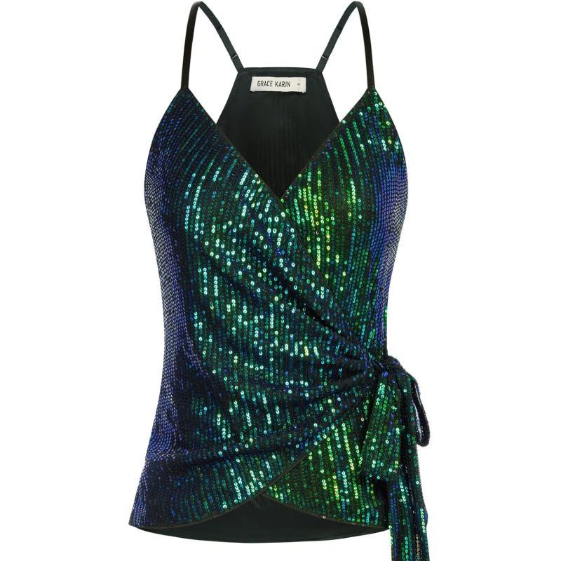 GRACE KARIN Sequin Tops for Women Sparkle Tank Camisole V Neck Sexy Tie Waist Top Party Club Cocktail Vest Shirt(Blue-green)