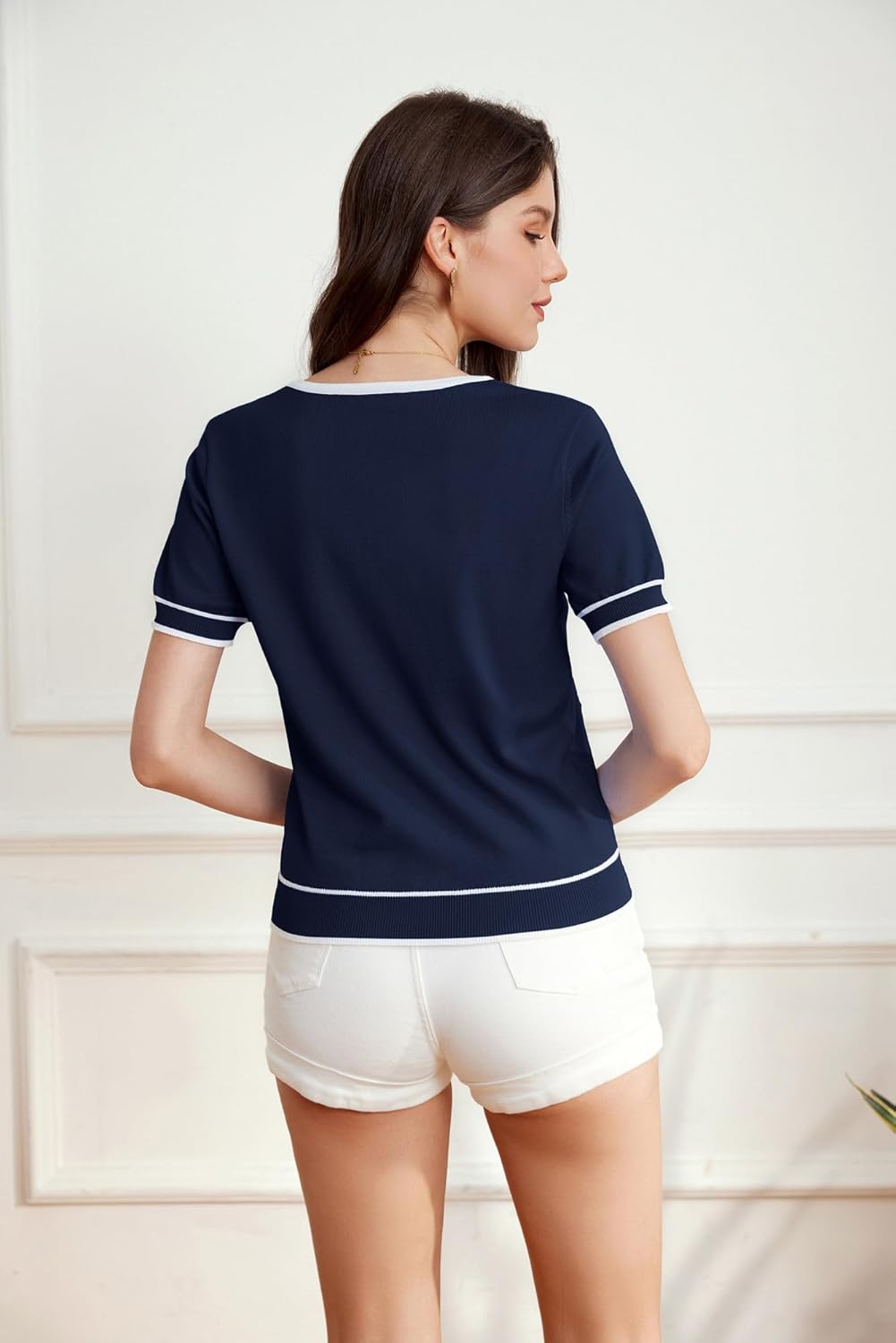 GRACE KARIN Short Sleeve Contrast Cardigan Sweaters for Women Summer Casual Striped Button Down Bolero ShrugNavy Bluewhite Edge