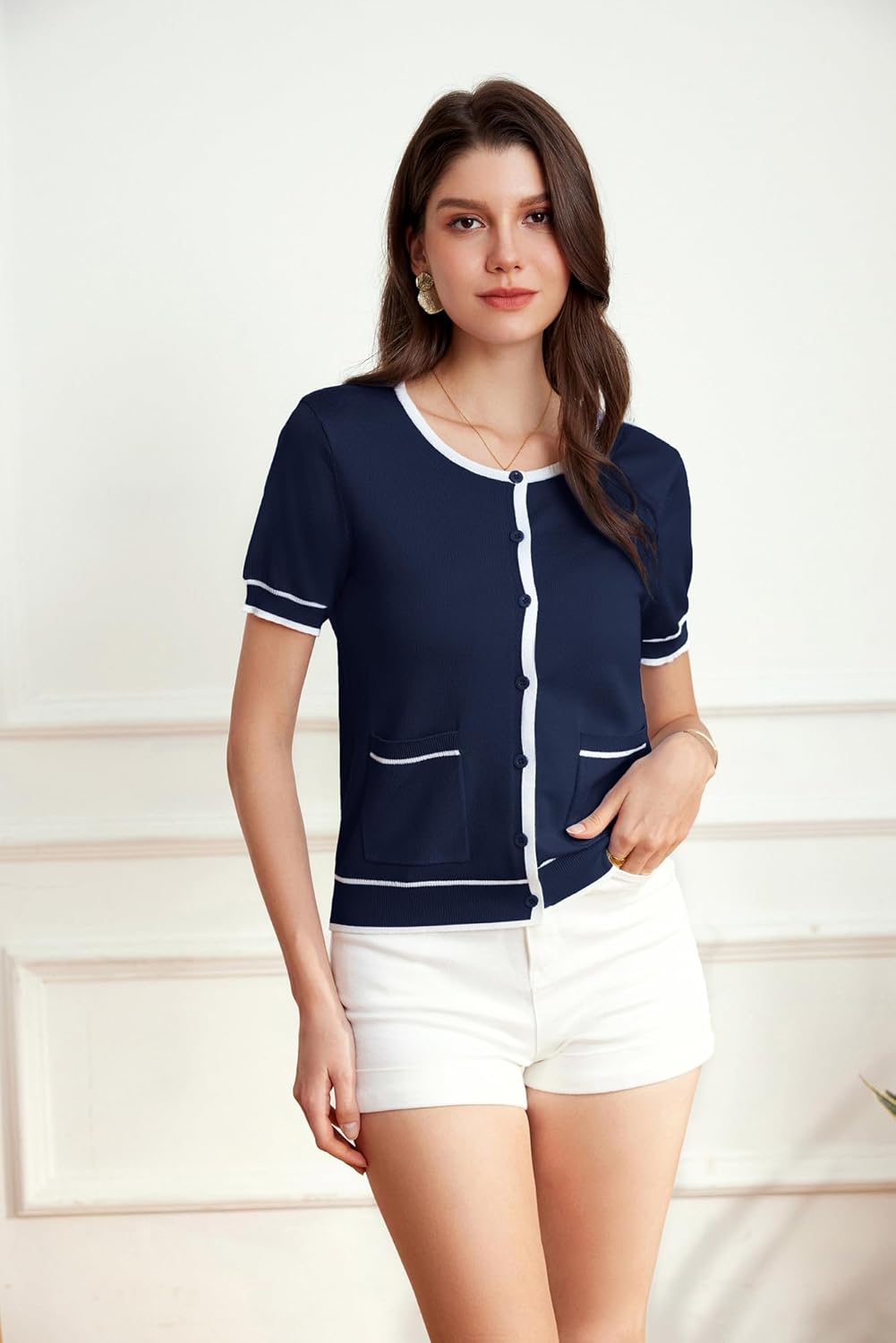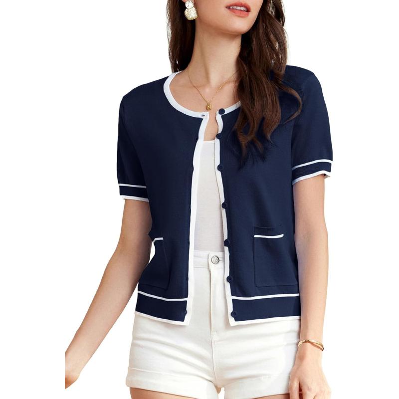 GRACE KARIN Short Sleeve Contrast Cardigan Sweaters for Women Summer Casual Striped Button Down Bolero Shrug(Navy Blue-white Edge)