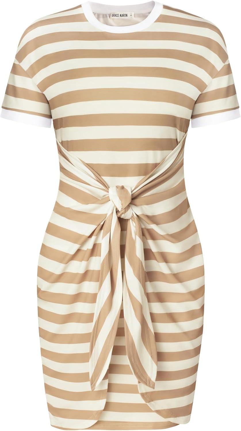 GRACE KARIN Striped Shirt Dresses for Women Front Tie Crewneck Wrap Dress Short Sleeve T-Shirt Casual Mini Bodycon Dress(Khaki)