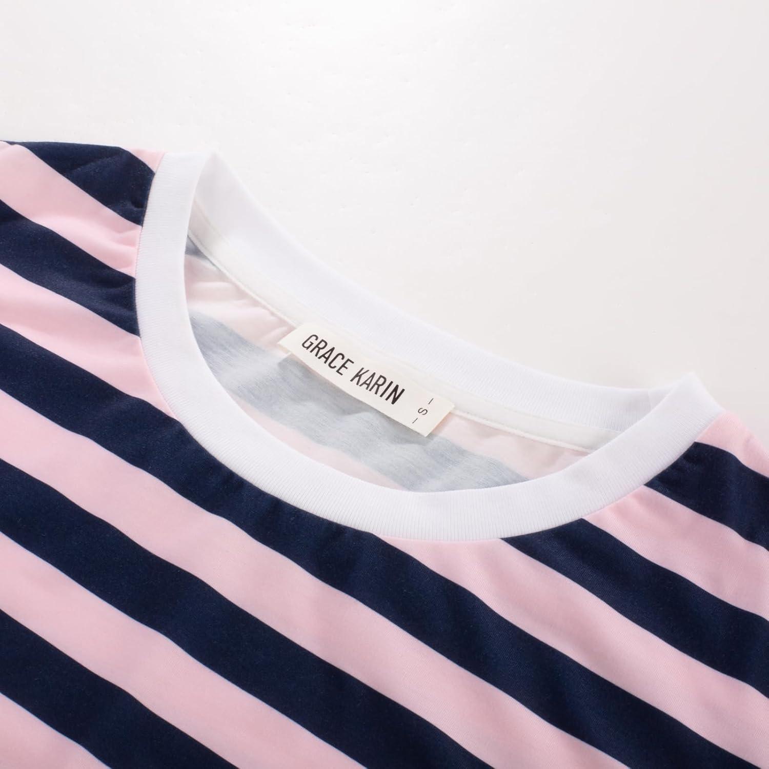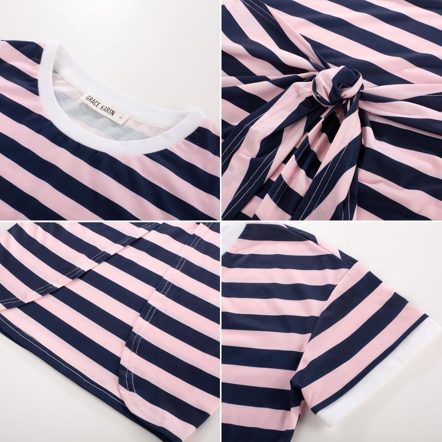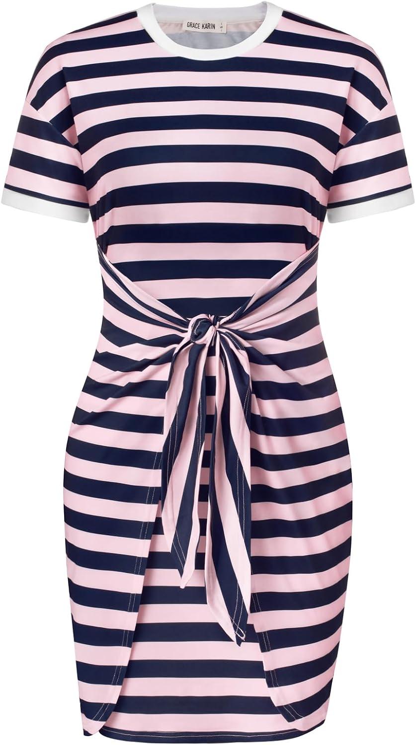 GRACE KARIN Striped Shirt Dresses for Women Front Tie Crewneck Wrap Dress Short Sleeve T-Shirt Casual Mini Bodycon Dress(Pink Navy Blue)