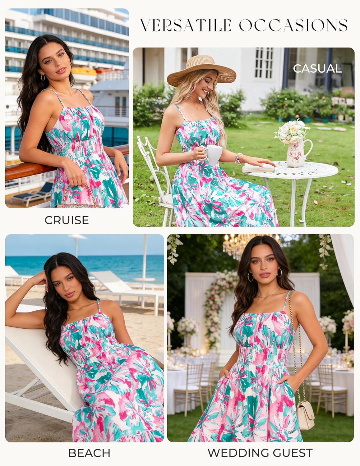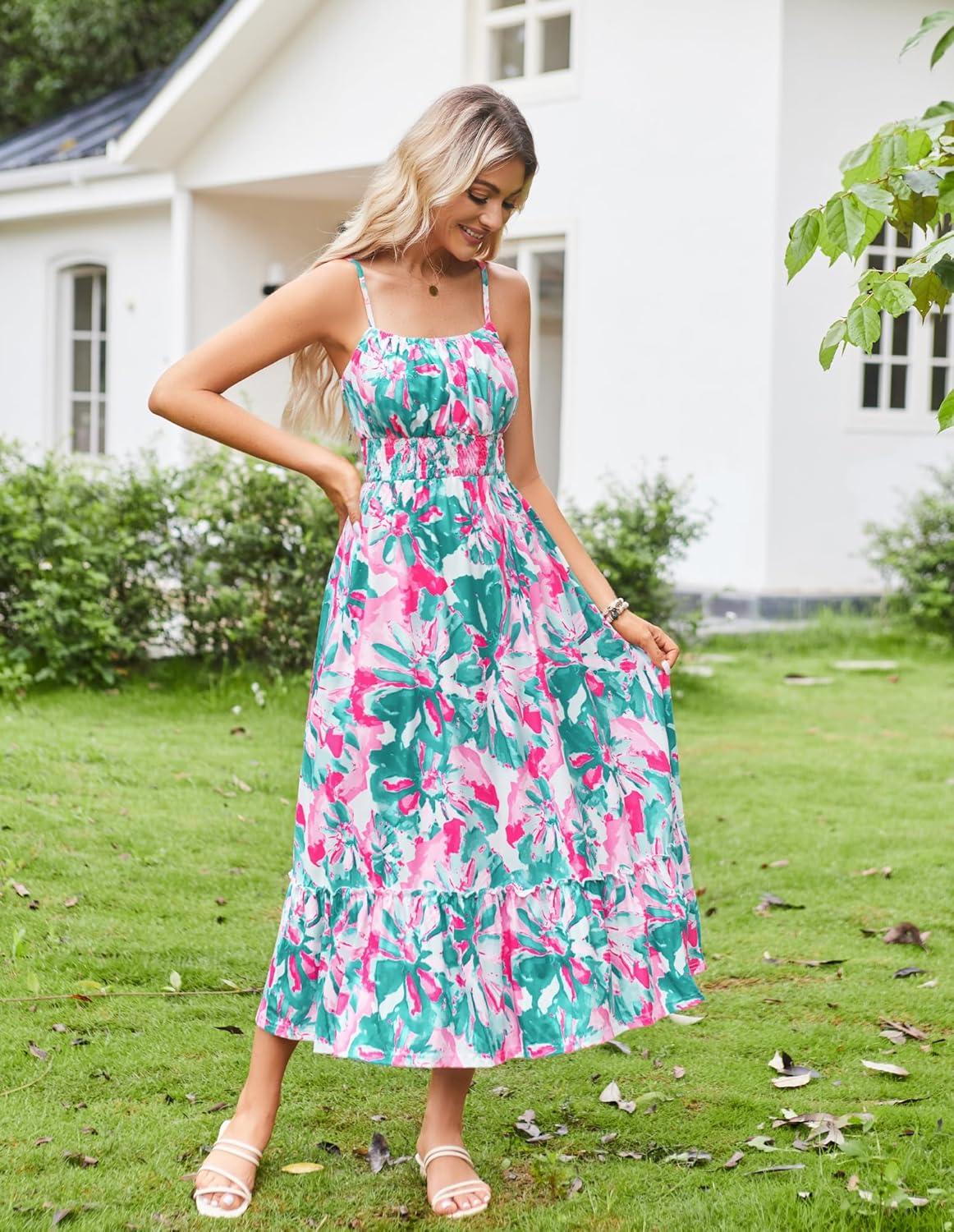 GRACE KARIN Summer Dresses for Women 2026 Vacation,Smocked Floral Maxi Dress,Boho Beach Sundress with Pocket Fashion Clothing(Green Pink Floral)