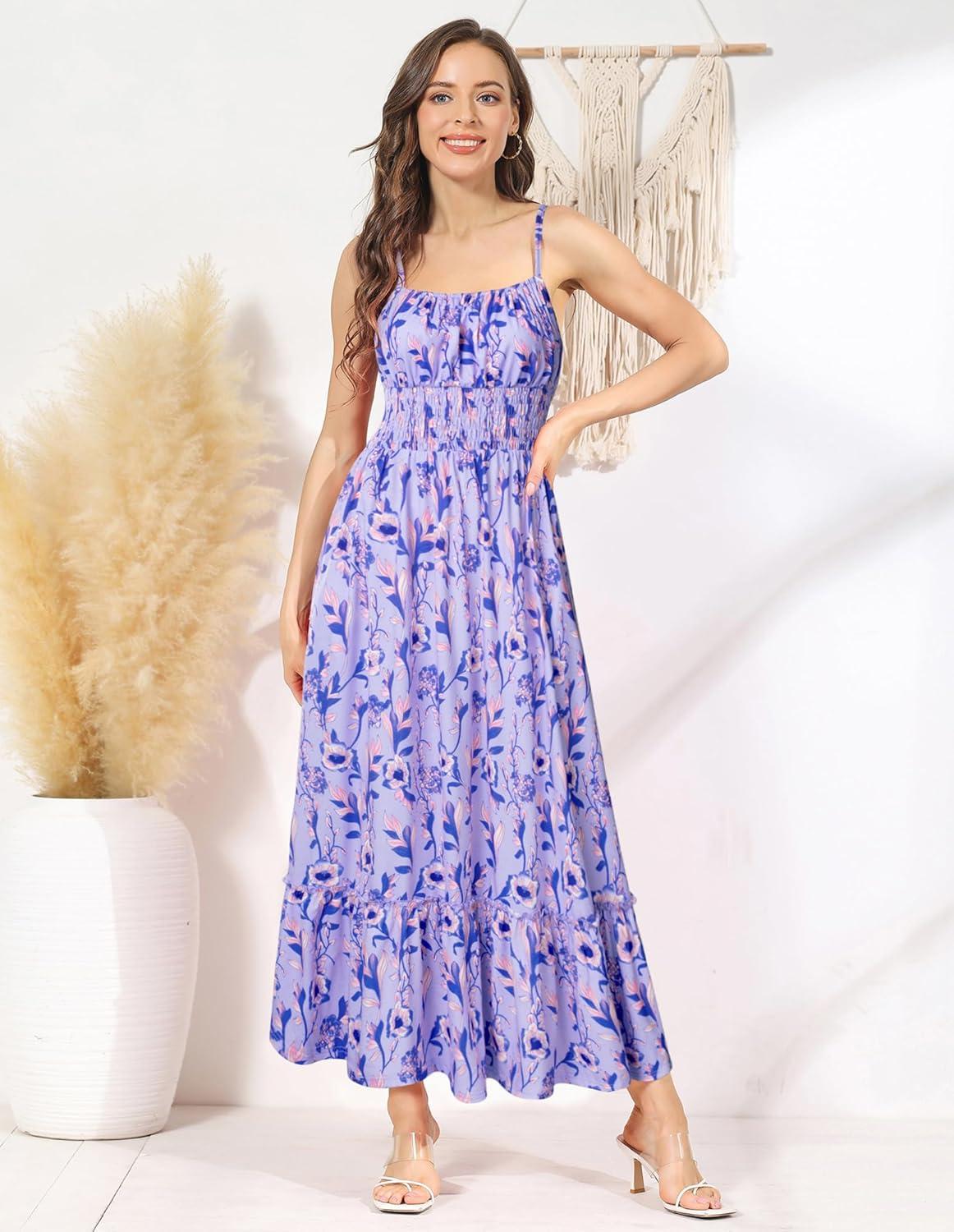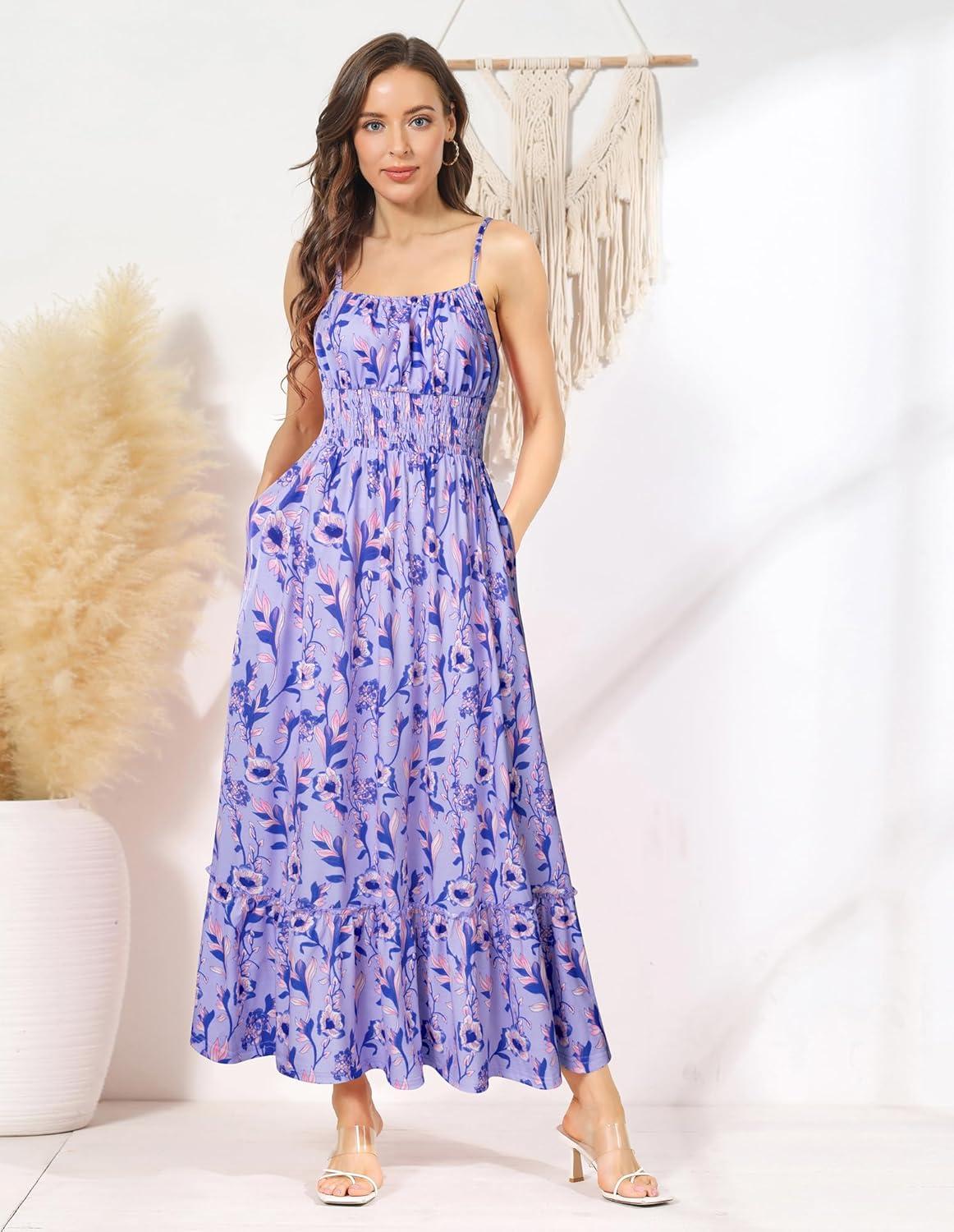 GRACE KARIN Summer Dresses for Women 2026 Vacation,Smocked Floral Maxi Dress,Boho Beach Sundress with Pocket Fashion Clothing(Purple Vine)