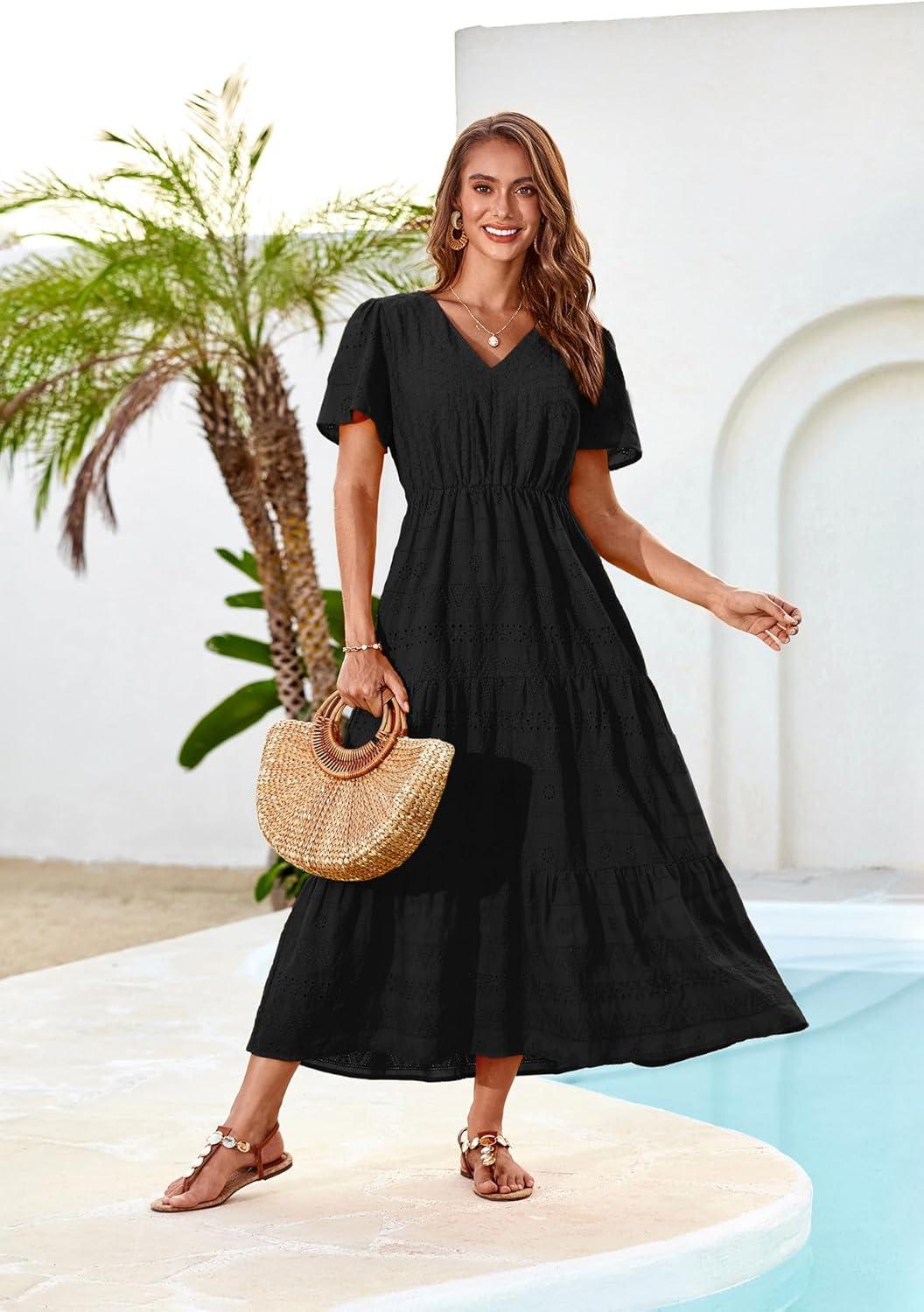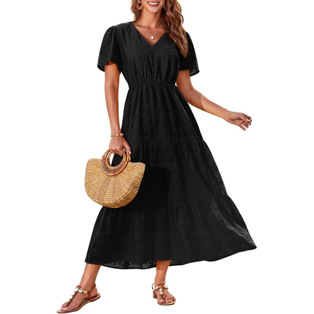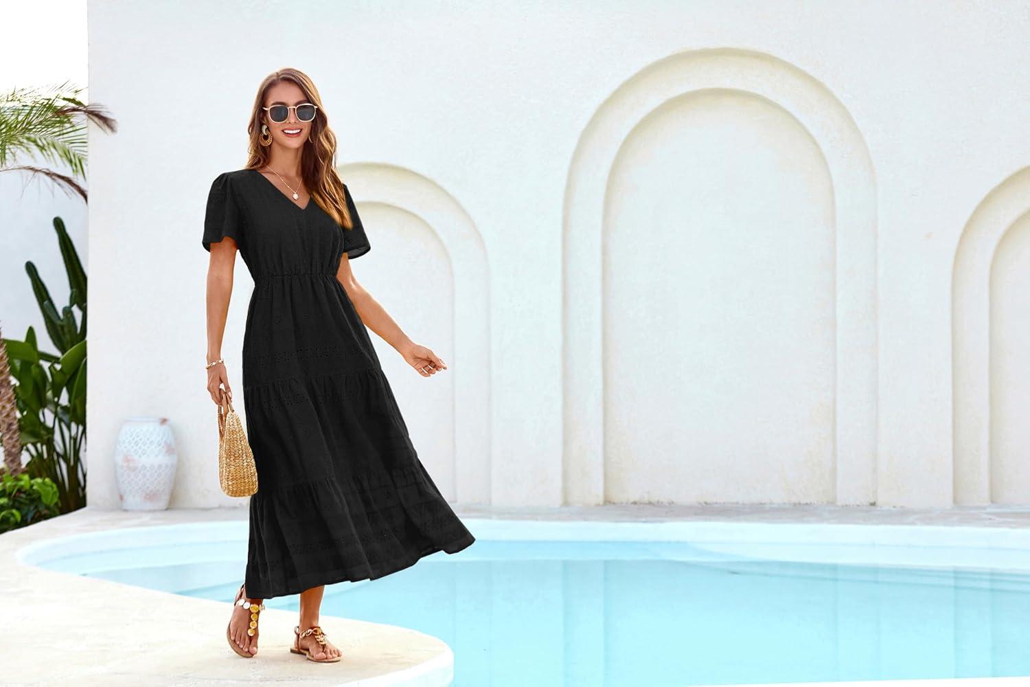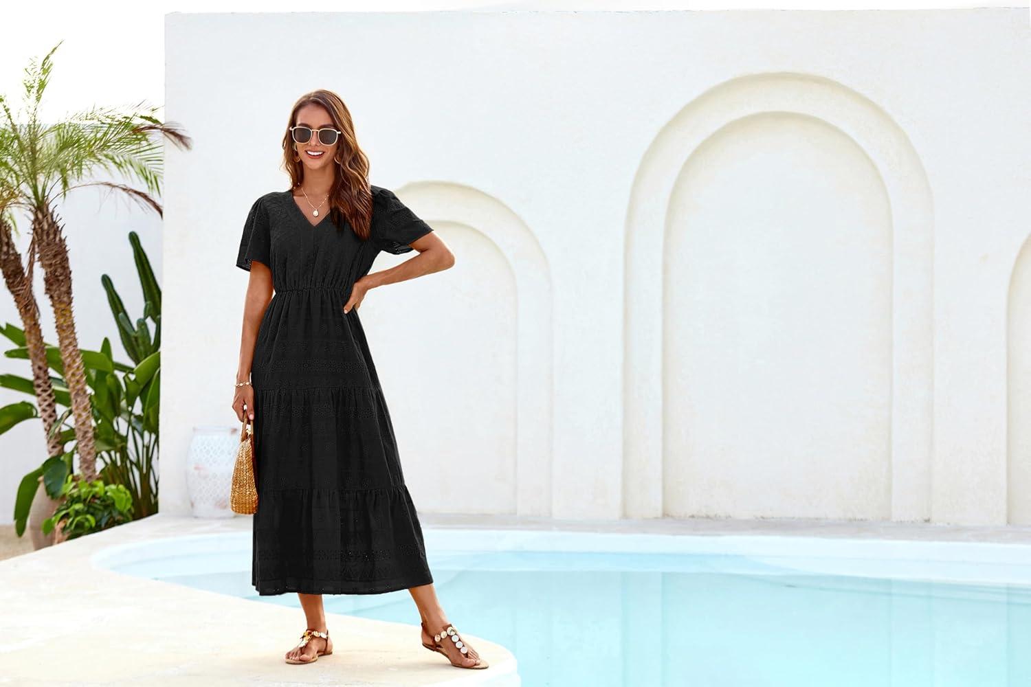 GRACE KARIN Summer Women's Maxi Dress Lace Flowy V-Neck Bohemian Beach Sundress Casual Tiered Elastic Waist Long Dresses(Black)