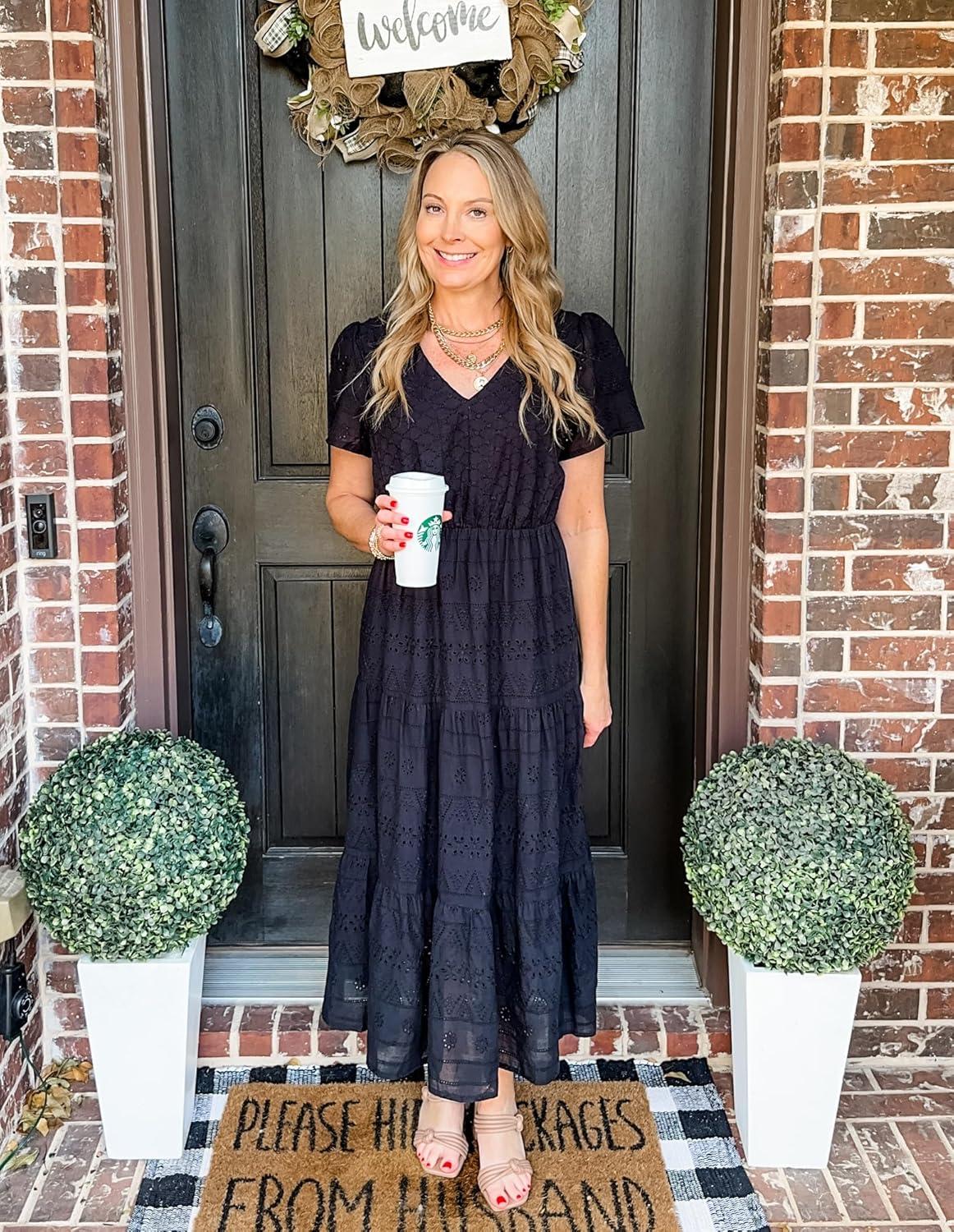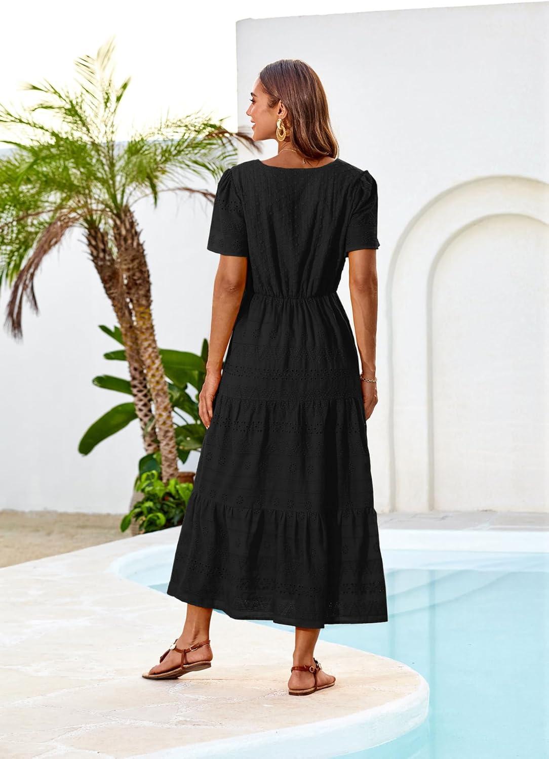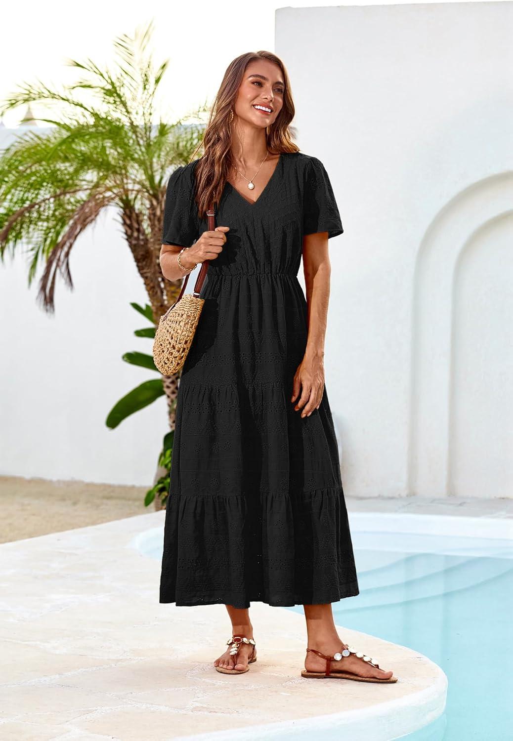 GRACE KARIN Summer Women's Maxi Dress Lace Flowy V-Neck Bohemian Beach Sundress Casual Tiered Elastic Waist Long Dresses(Black)