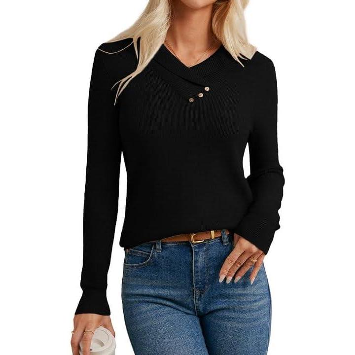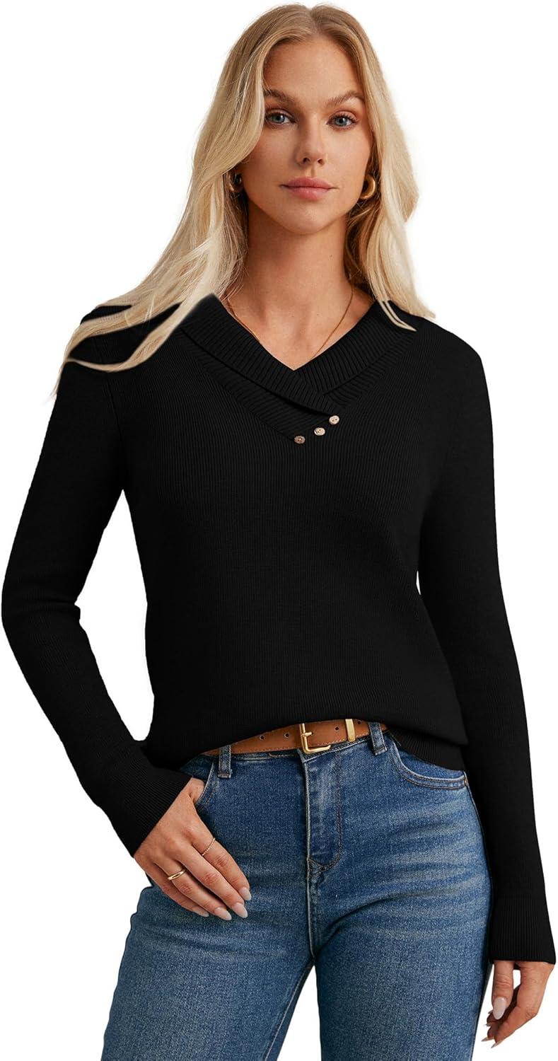 imageGRACE KARIN Sweaters for Women 2025 Fall Long Sleeve V Neck Collared Knitted Pullover Sweaters Dressy Casual TopsBlack