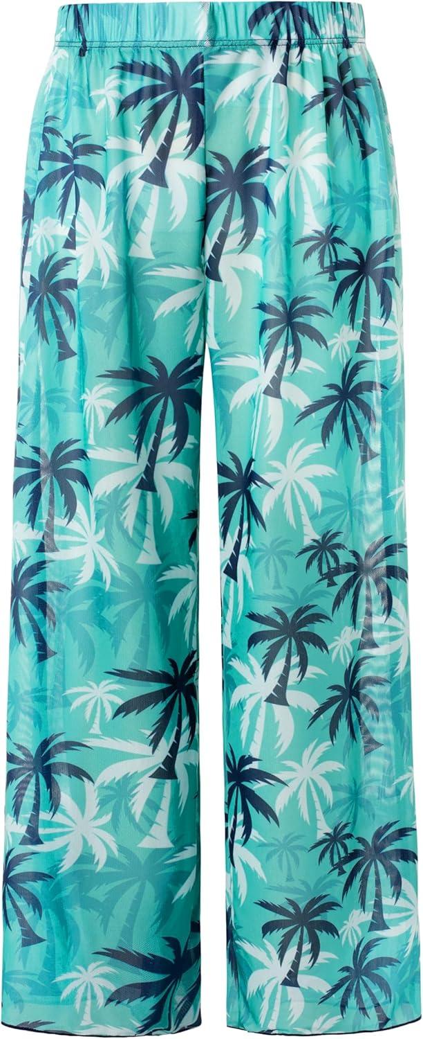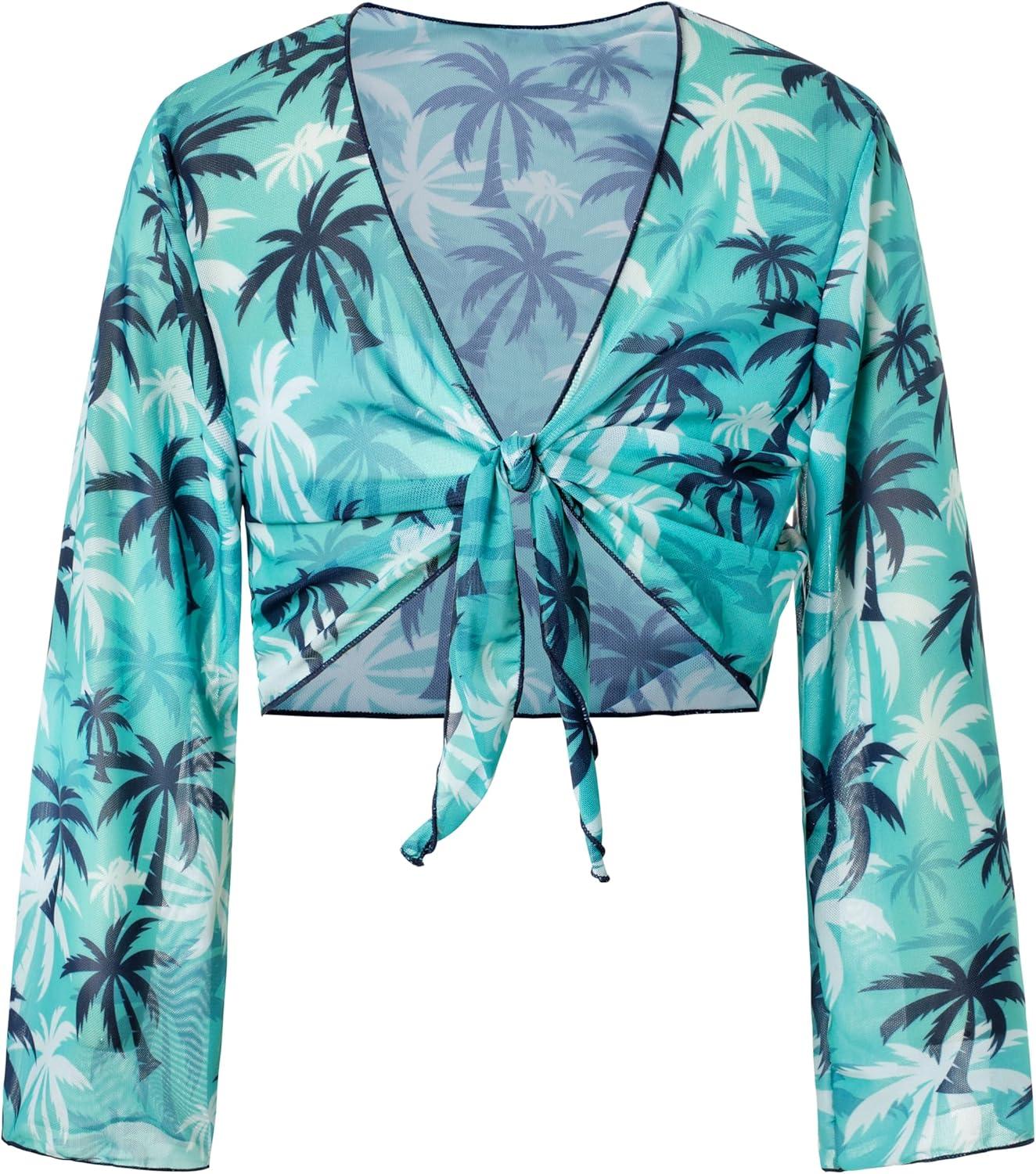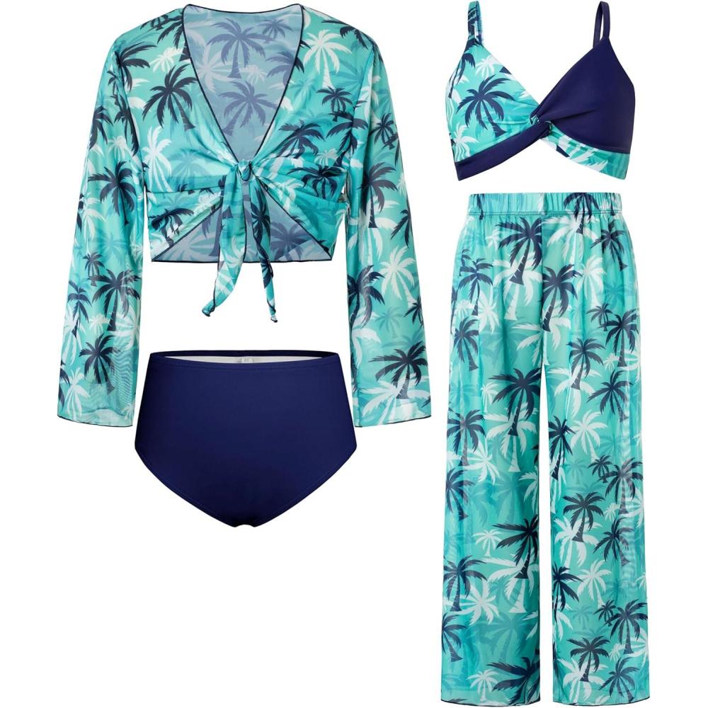 GRACE KARIN Teen Girls Bathing Suits Kids 4 Piece Long Sleeve Swimsuit Kimono Up Pants Bikini Tankini Set Swimwear(Blue-coconut Tree New)
