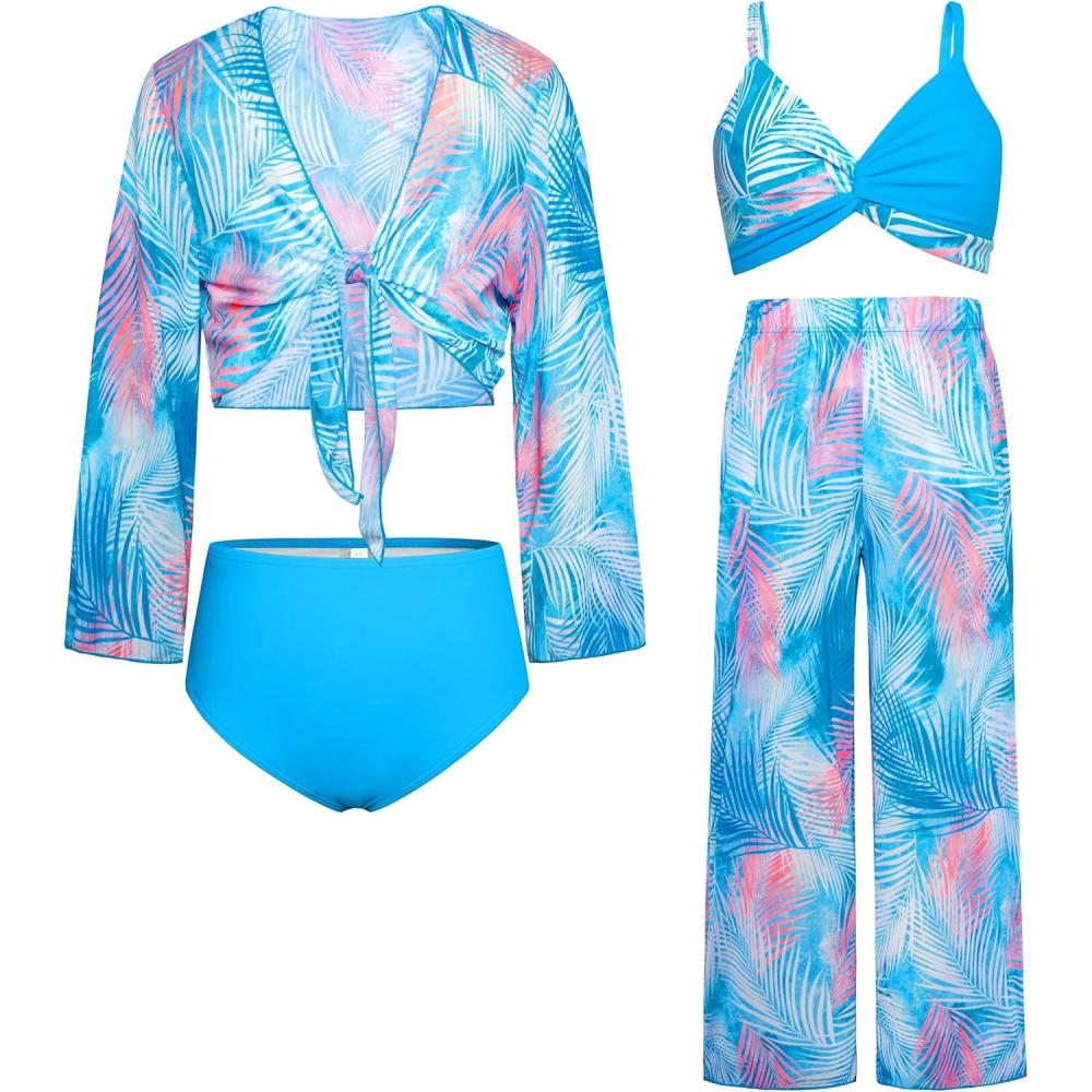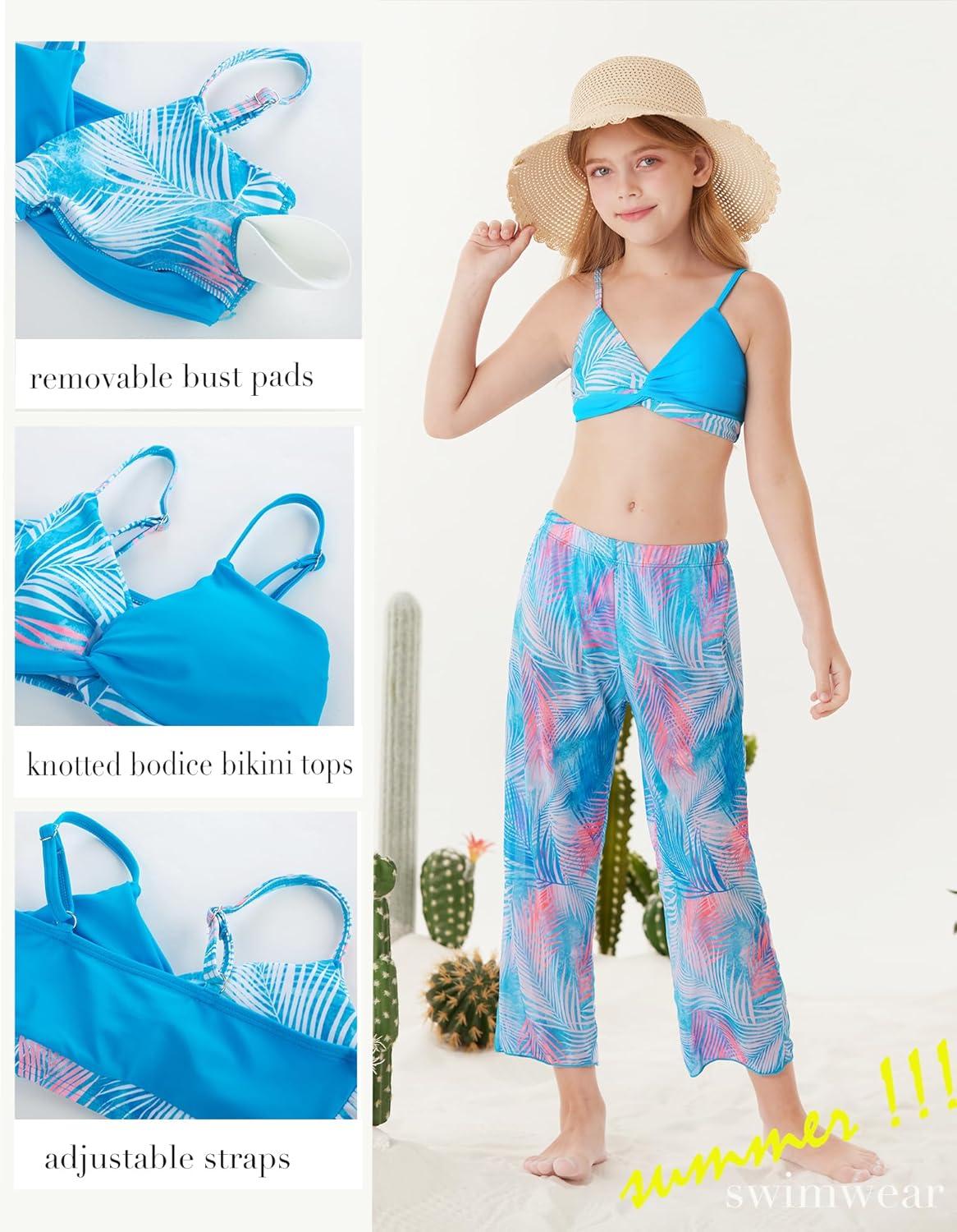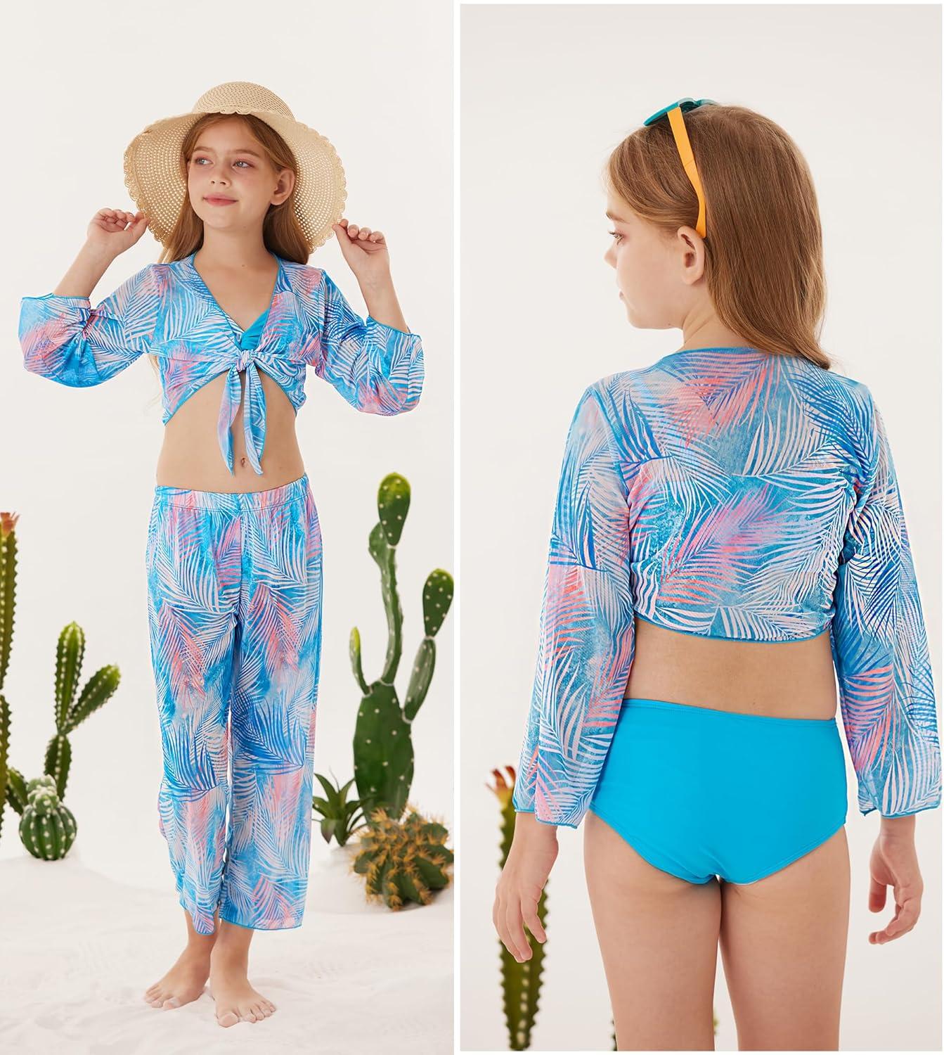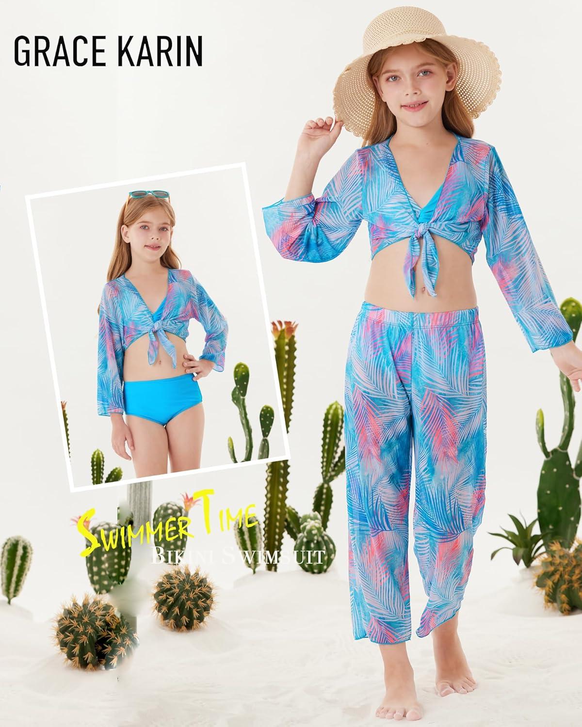 GRACE KARIN Teen Girls Bathing Suits Kids 4 Piece Long Sleeve Swimsuit Kimono Up Pants Bikini Tankini Set Swimwear(Blue-feather)