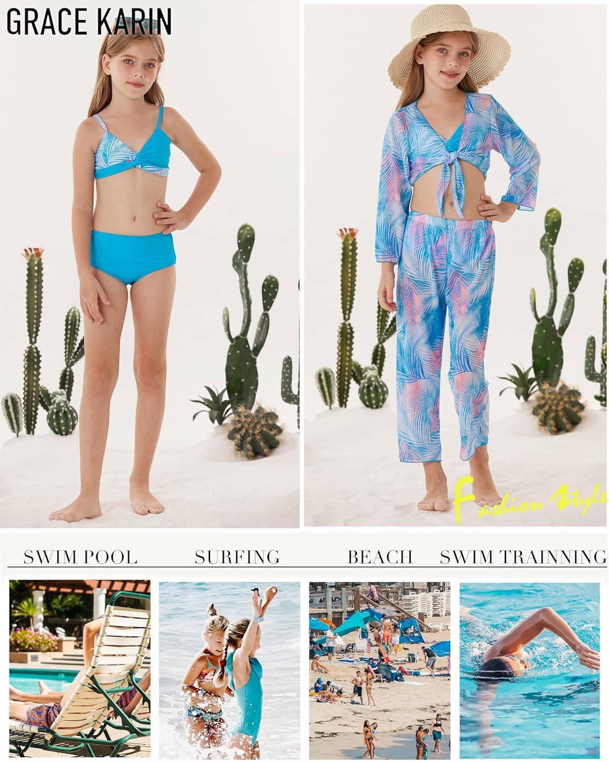 imageGRACE KARIN Teen Girls Bathing Suits Kids 4 Piece Long Sleeve Swimsuit Kimono Up Pants Bikini Tankini Set SwimwearBluefeather