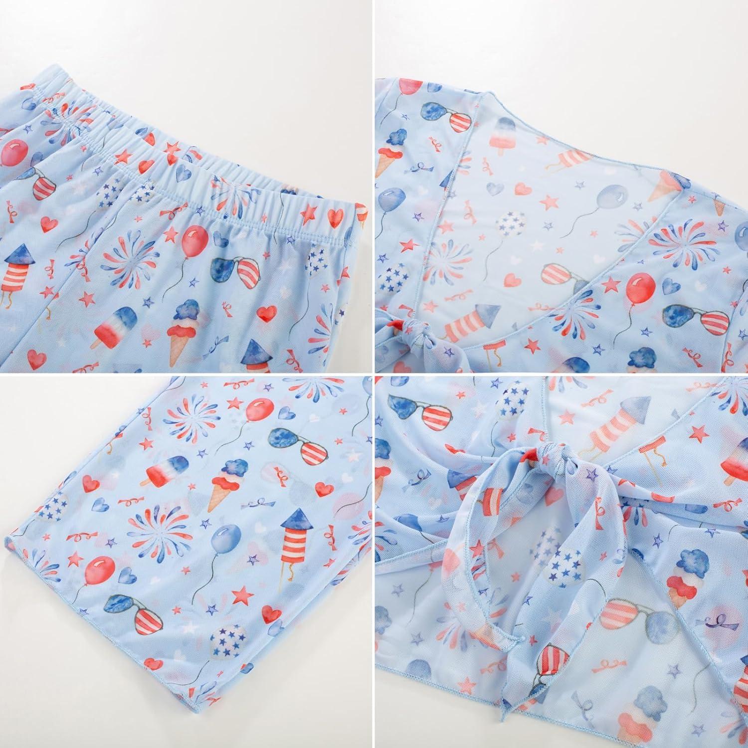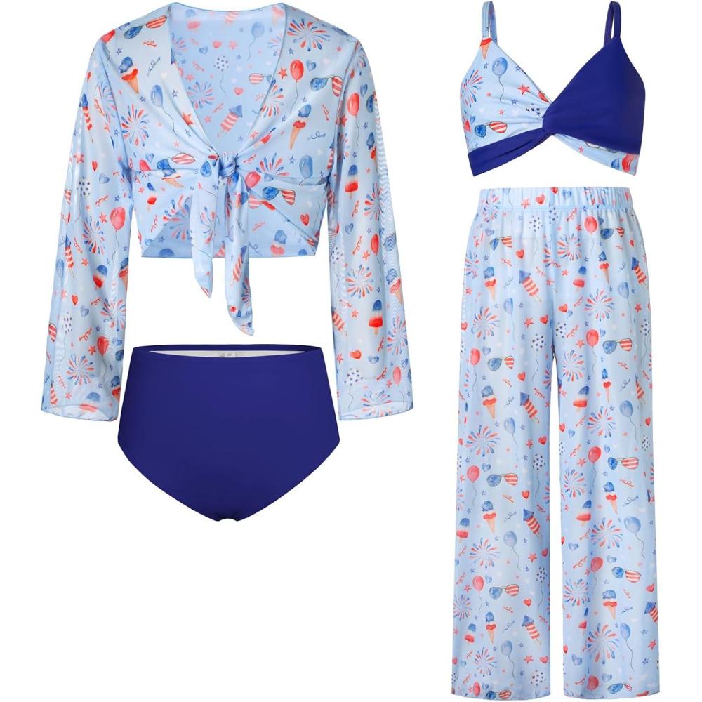 GRACE KARIN Teen Girls Bathing Suits Kids 4 Piece Long Sleeve Swimsuit Kimono Up Pants Bikini Tankini Set Swimwear(Blue-ice Cream)