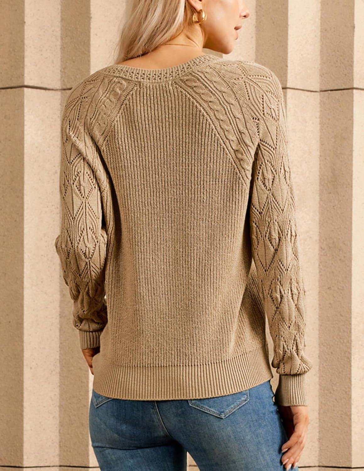 GRACE KARIN V Neck Sweater for Women Crochet Pullover Sweater Tops Cable Knit Sleeve Sweaters Spring Summer Fashion 2025(Khaki)