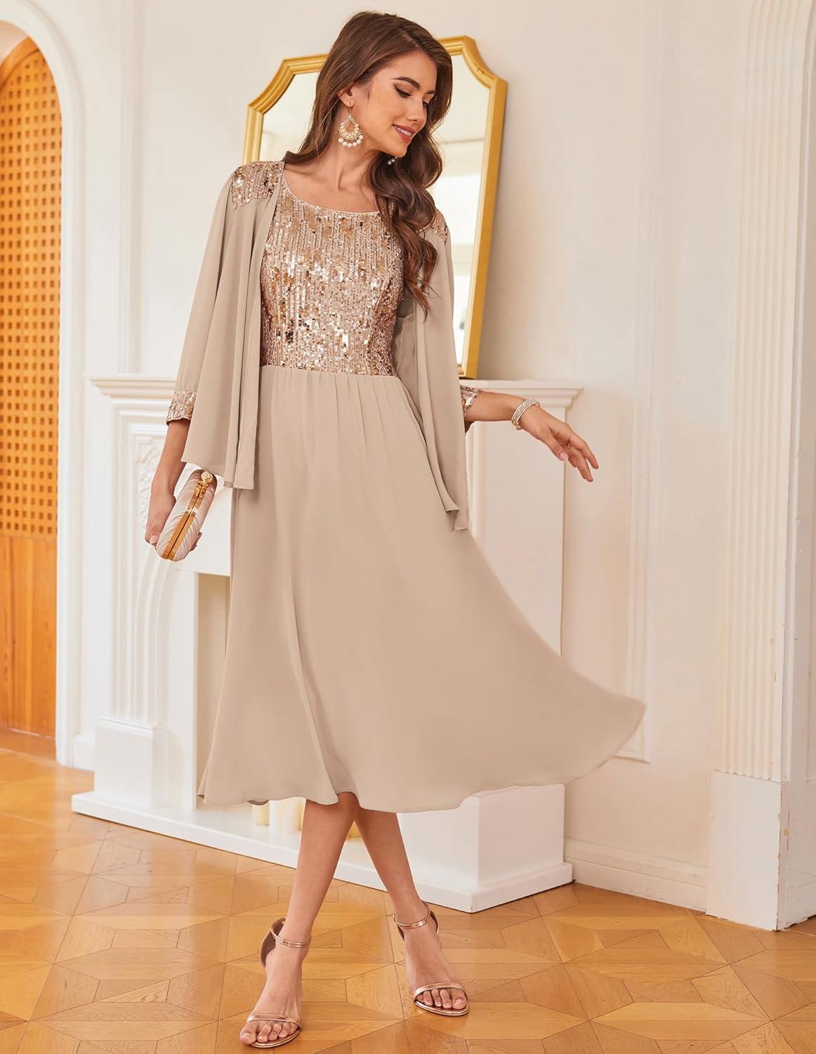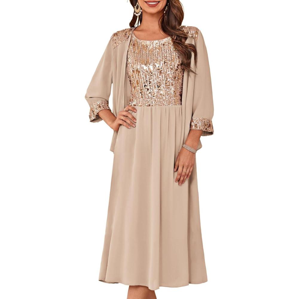 GRACE KARIN Wedding Guest Dress Mother of The Bride Dresses Two Piece Formal Sequin Dress with Jacket Tea Length 2025(Champagne)
