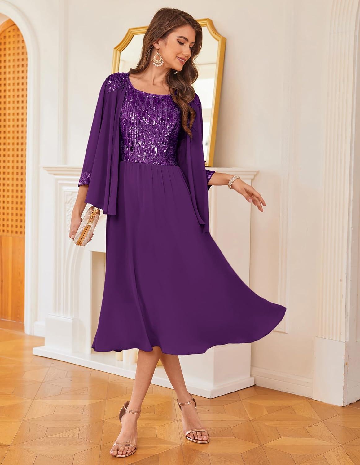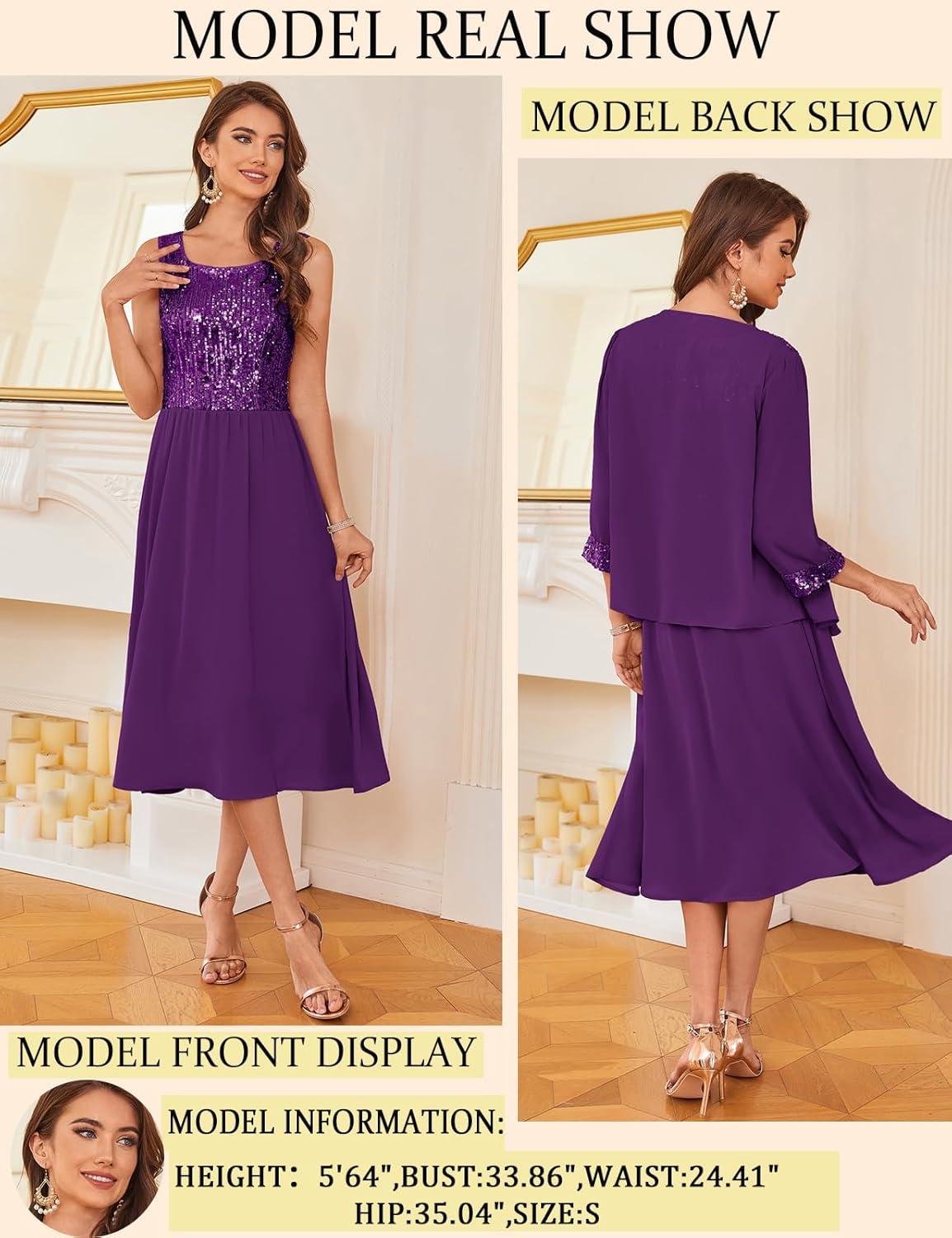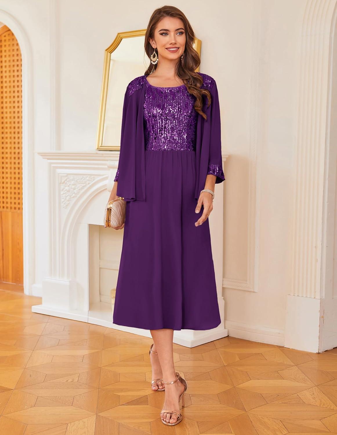 GRACE KARIN Wedding Guest Dress Mother of The Bride Dresses Two Piece Formal Sequin Dress with Jacket Tea Length 2025(Dark Purple)