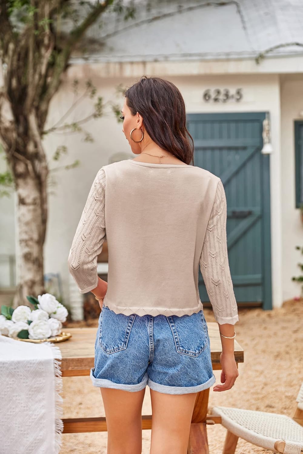 GRACE KARIN Women 34 Sleeve HollowedOut Cropped Cardigan Sweater Open Front Lightweight ShrugsApricot