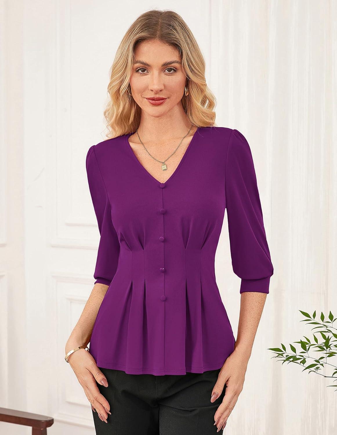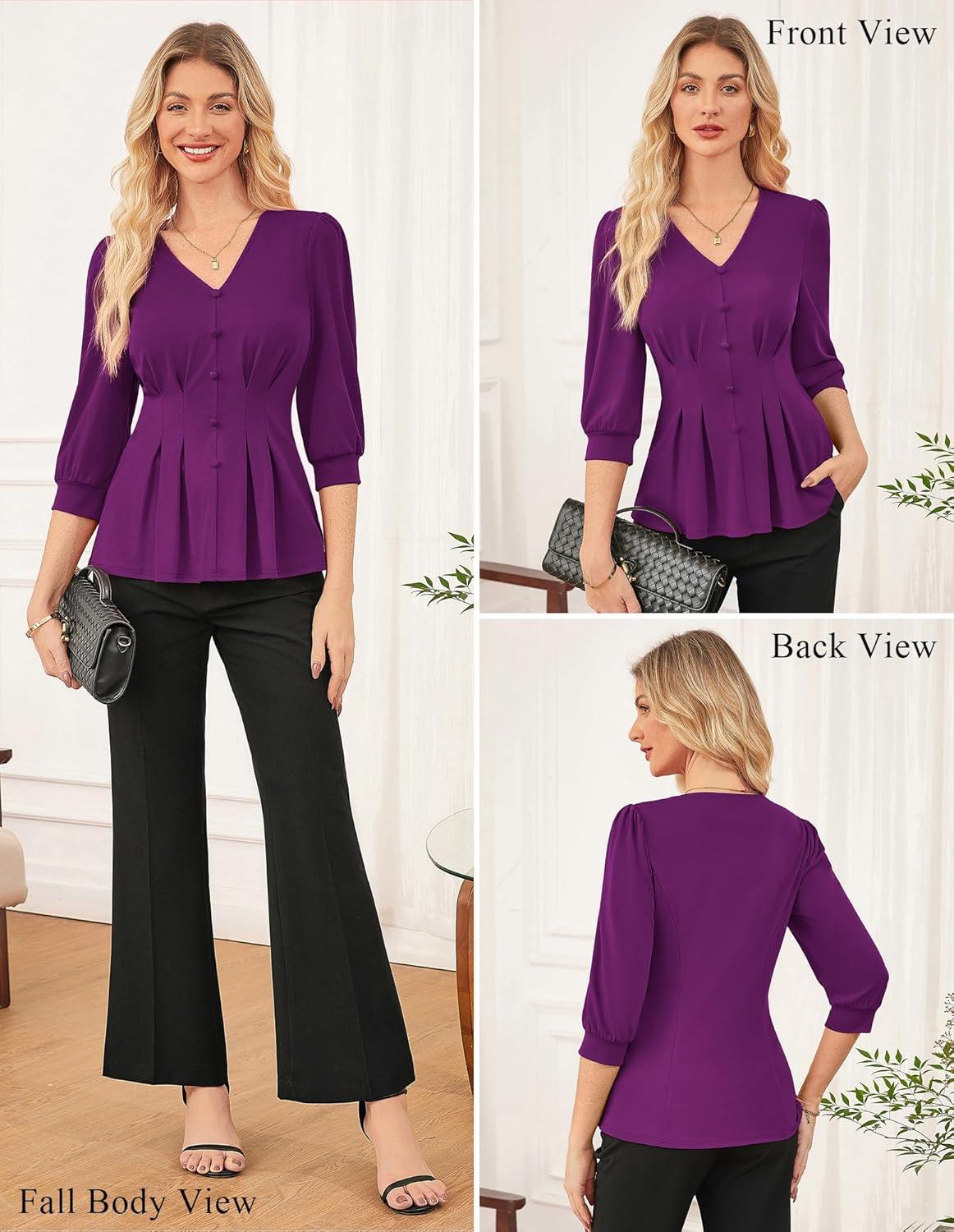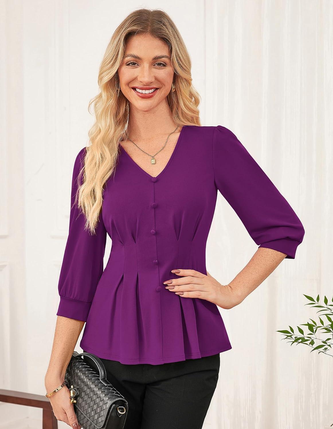 GRACE KARIN Women Business Casual Tops, 2025 Fall Trendy Dressy Blouses, 3/4 Sleeve Peplum Work Shirts V Neck Office Outfits(Purple)