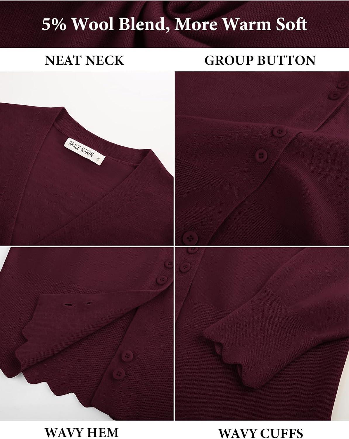 imageGRACE KARIN Women Cropped Cardigan Sweaters Lightweight Long Sleeve Shrug Button Up V Neck Knit Sweater Tops FallDark Red