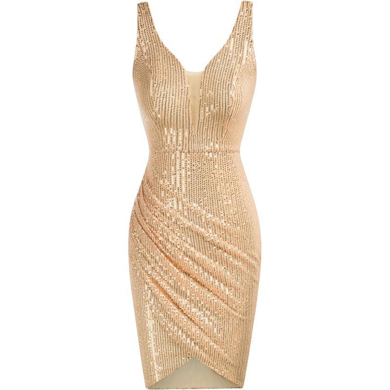 GRACE KARIN Women Deep V Neck Party Mini Dress U Back Sequin Irregular Hem Evening Dress(Gold)