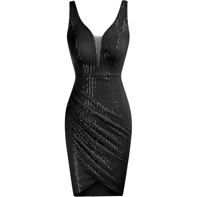 GRACE KARIN Women Deep V Neck Party Mini Dress U Back Sequin Irregular Hem Evening DressSequin Black