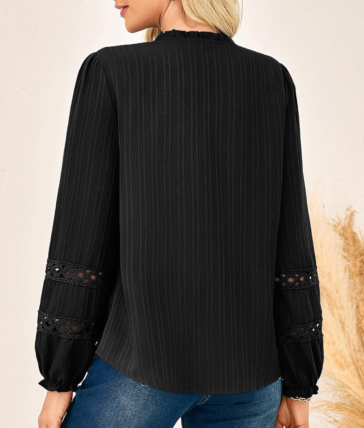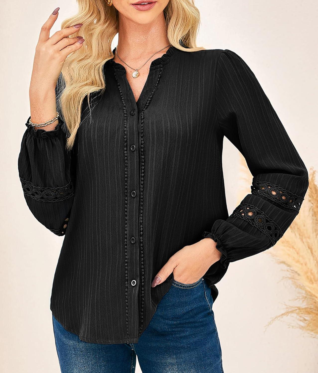 GRACE KARIN Women Dressy Casual Tops Long Sleeve Button Down Ruffle V Neck Blouse Business Work Shirt Summer Fall Outfit(Black)