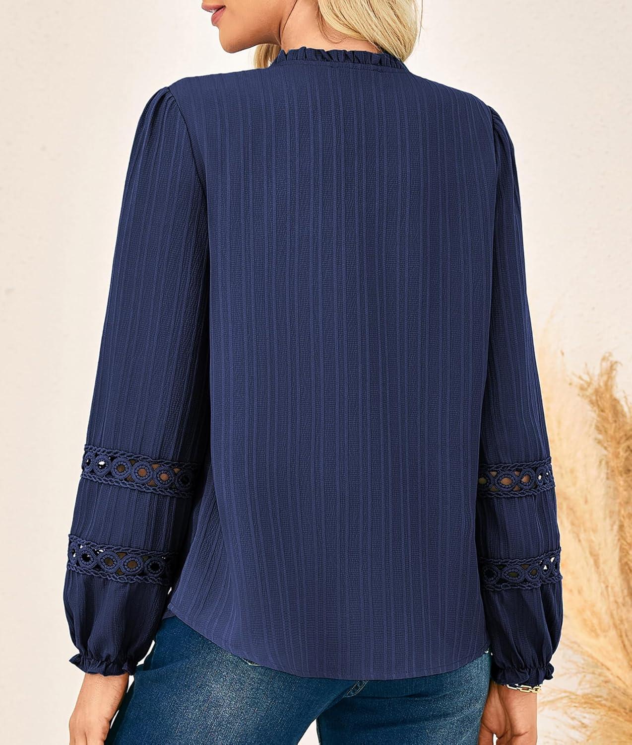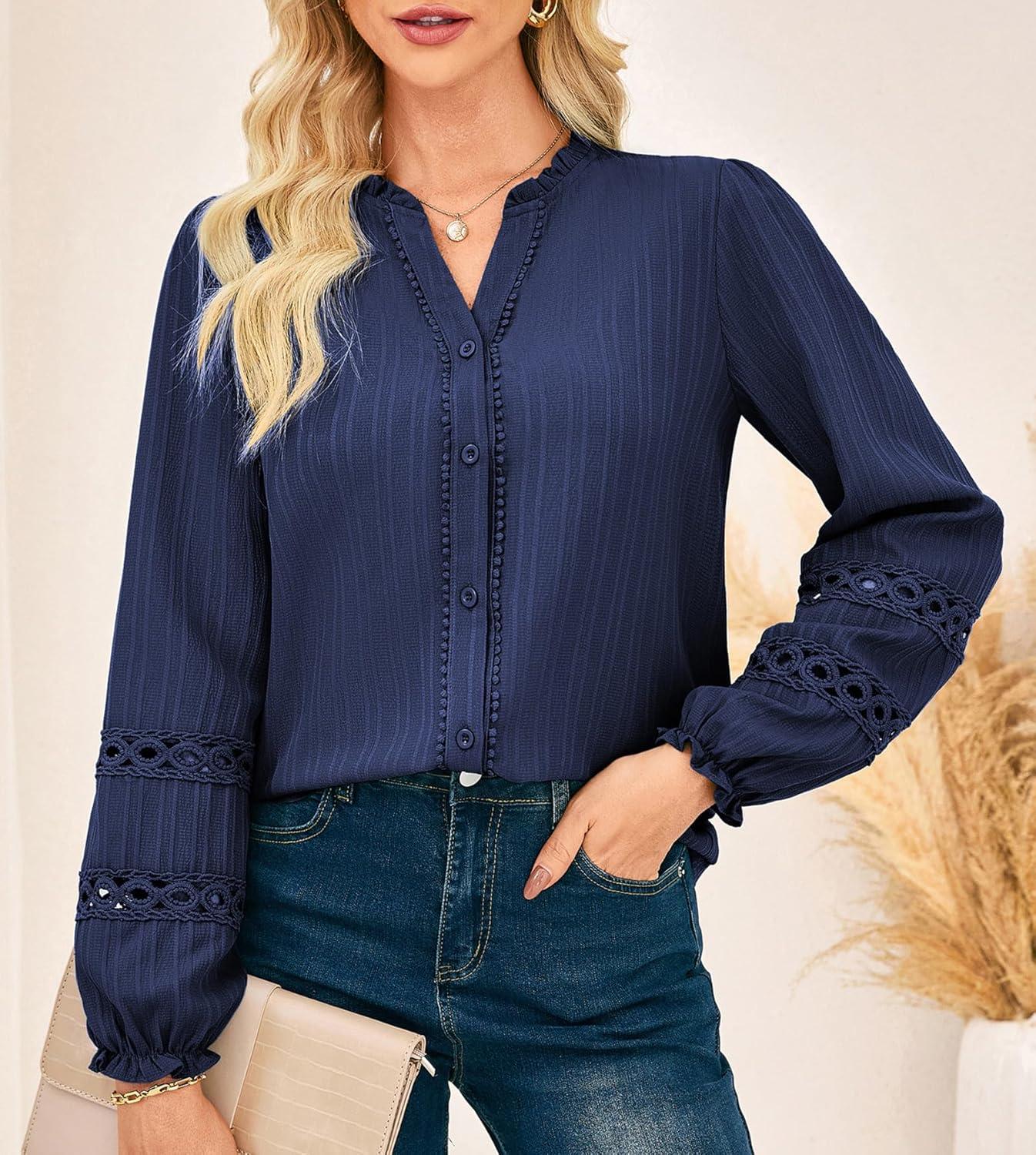 GRACE KARIN Women Dressy Casual Tops Long Sleeve Button Down Ruffle V Neck Blouse Business Work Shirt Summer Fall Outfit(Navy Blue)
