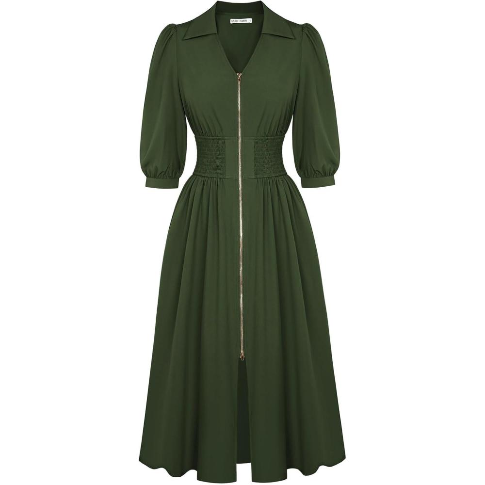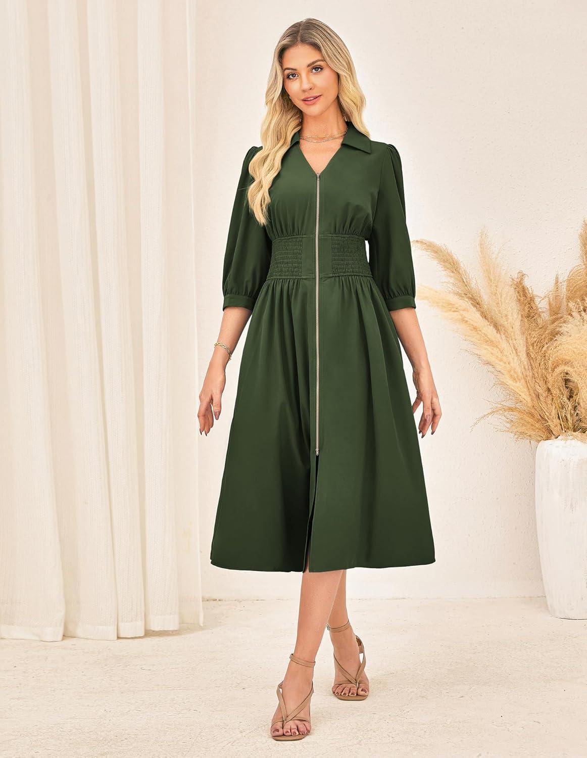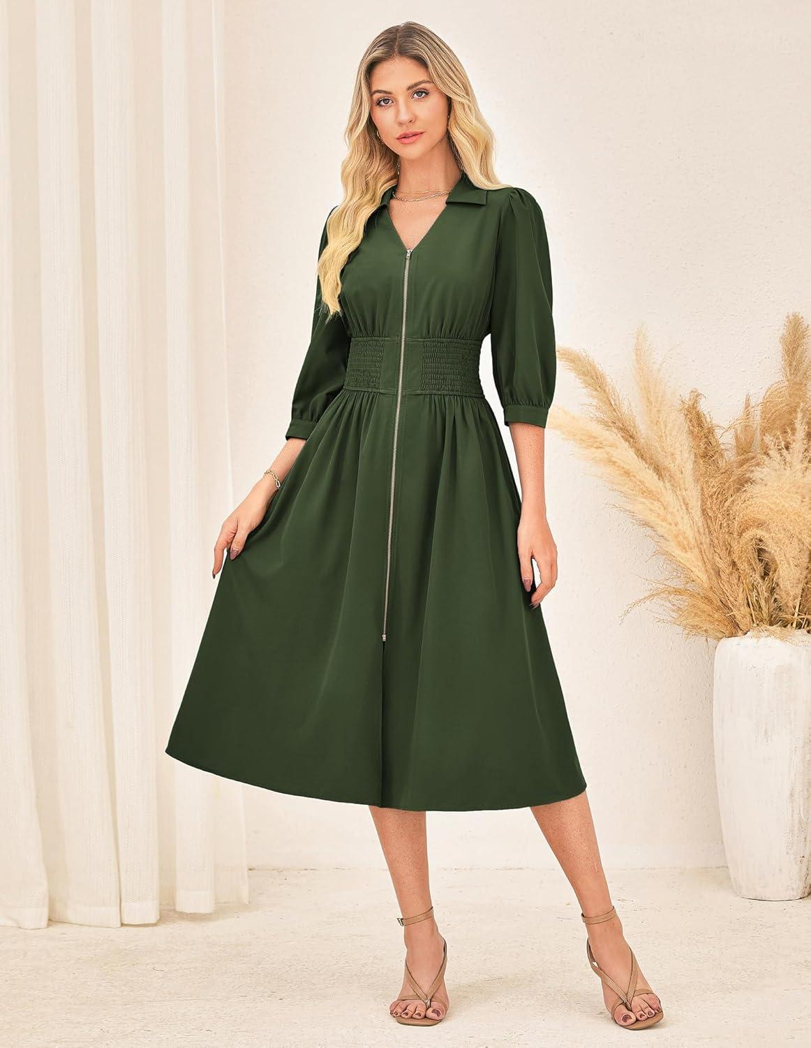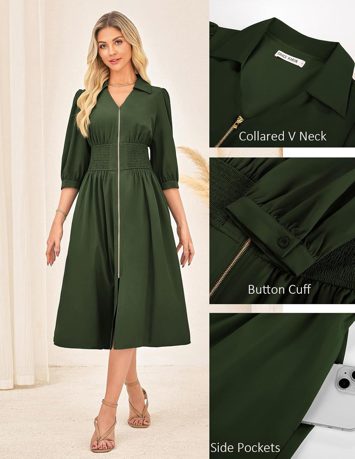 GRACE KARIN Women Fall Midi Dress 2025 A Line Smocked Work Dress Fit and Flare V Neck Zipper 3/4 Sleeve Dress Casual Pockets(Army Green)