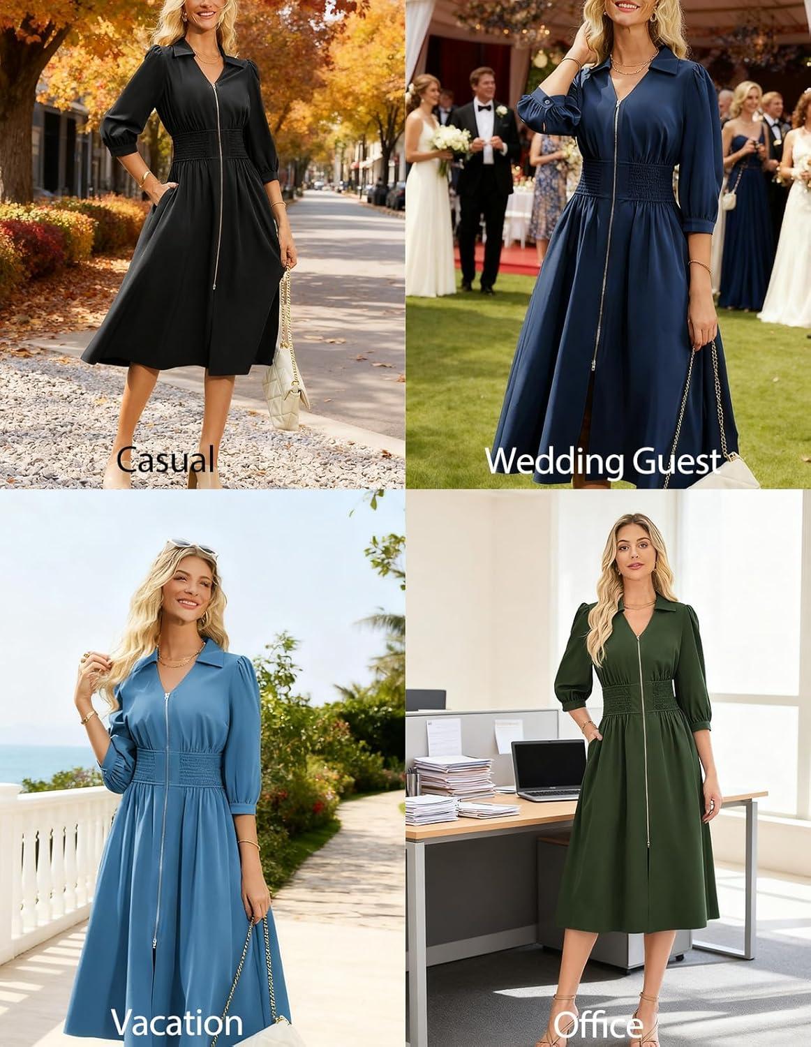 GRACE KARIN Women Fall Midi Dress 2025 A Line Smocked Work Dress Fit and Flare V Neck Zipper 3/4 Sleeve Dress Casual Pockets(Black)