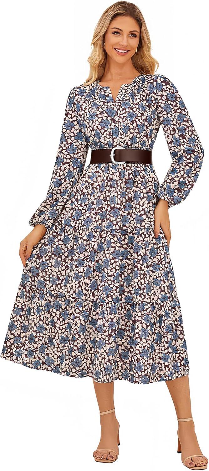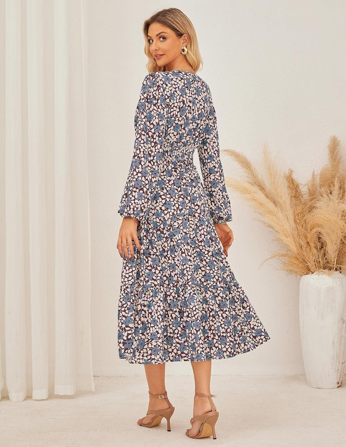 GRACE KARIN Women Fall Wedding Guest Dresses 2025 Floral Long Sleeve Maxi Dress Boho V Neck Empire Waist Dress(Red Blue Floral)