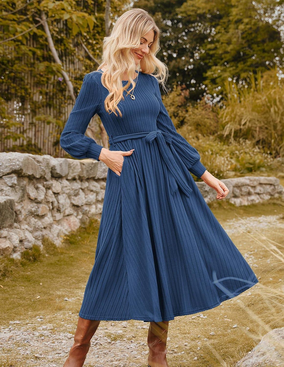 GRACE KARIN Women Long Sleeve Knit Dress 2025 Fall Tie Waist Crew Neck Ribbed Casul A Line Midi Dress(Blue)