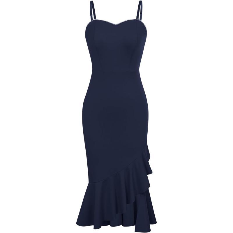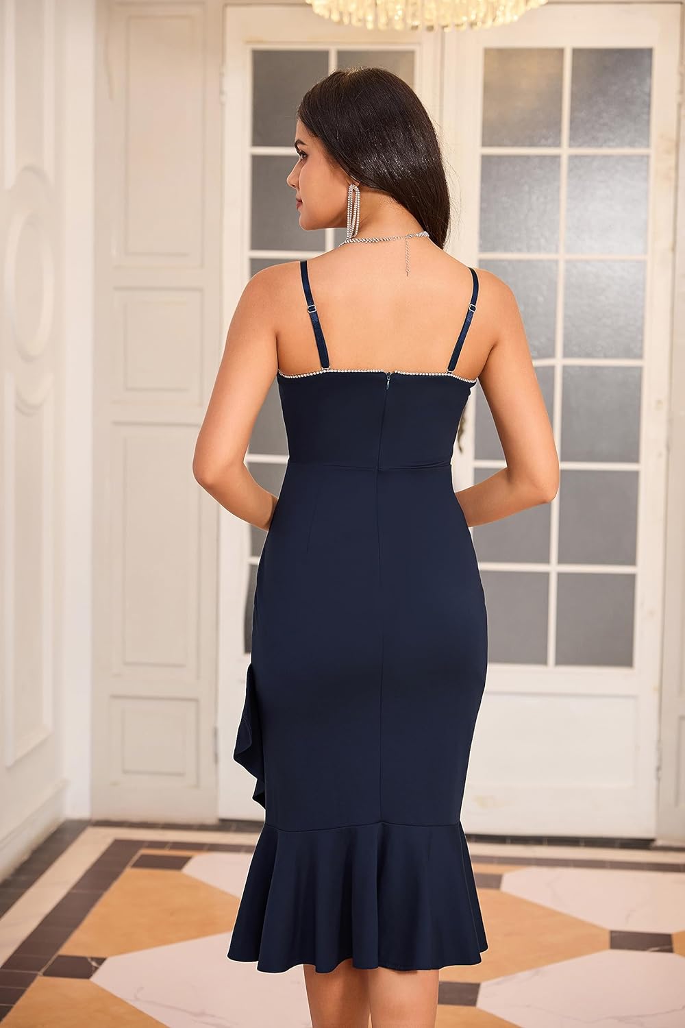 GRACE KARIN Women Mermaid Bodycon Dress V Neck Spaghetti Strap Side Split Ruffle Hem Midi Formal Cocktail DressesNavy