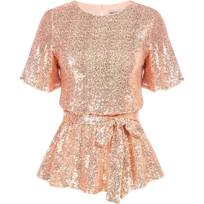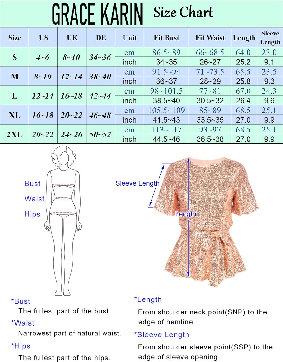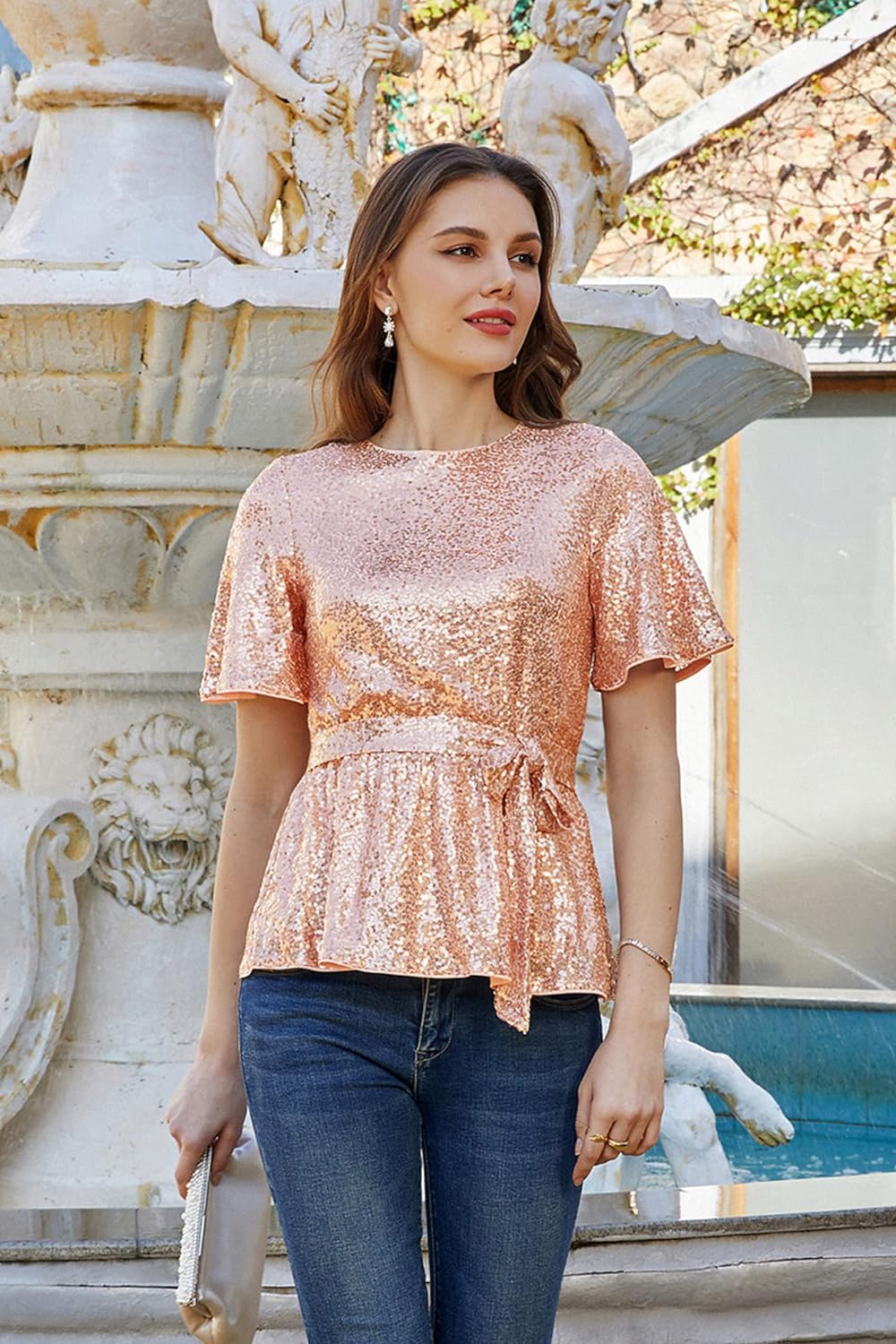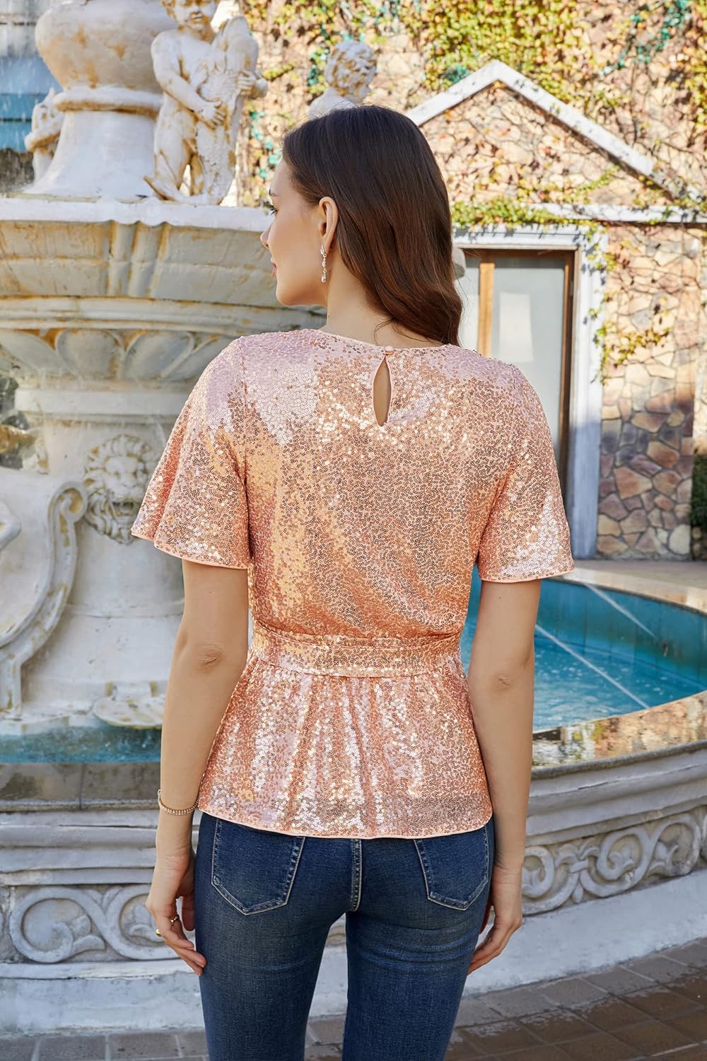【Features】Sparkle sequin tops for women is designed with Dressy Elegant Peplum ,Elastic Waist, Removable Tie, Short Bell Sleeve, Pull on closure, Slim Fit Blouse, Flared Short Sleeve Blouse