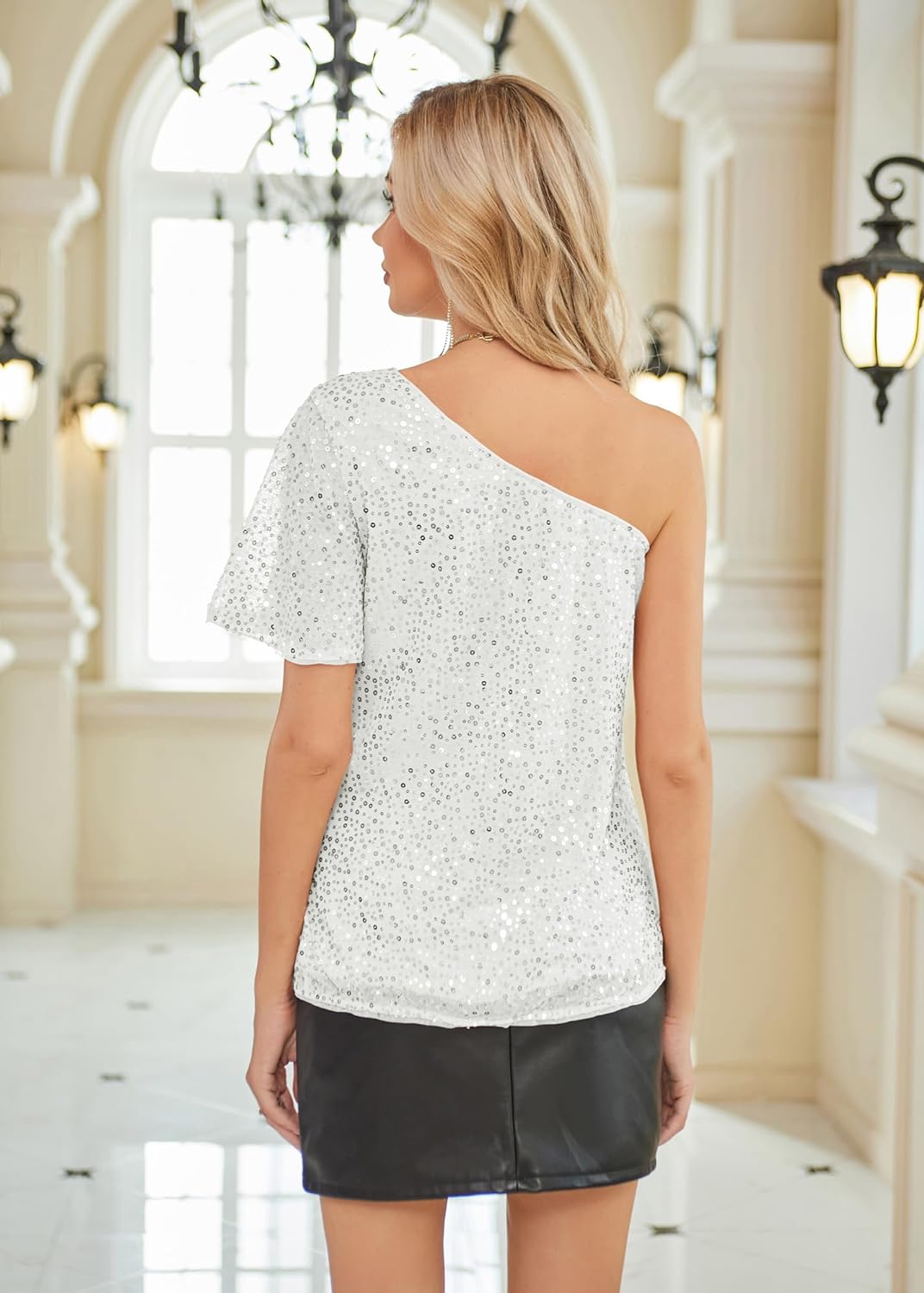 DESIGN: Sparkle Tops With All Over Sparkle Sequin, Asymmetric One-Shoulder, Ruffle Sleeve, Fully Lined, Glittery Oblique Neckline, Strong Drappy