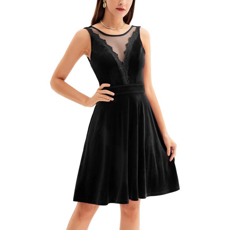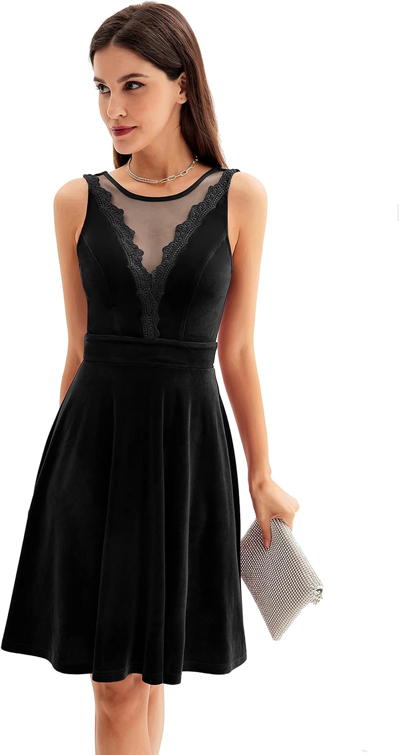 GRACE KARIN Women Sleeveless Lace Patchwork Deep V-Neck A Line Flared Party Dress(Black-velvet)