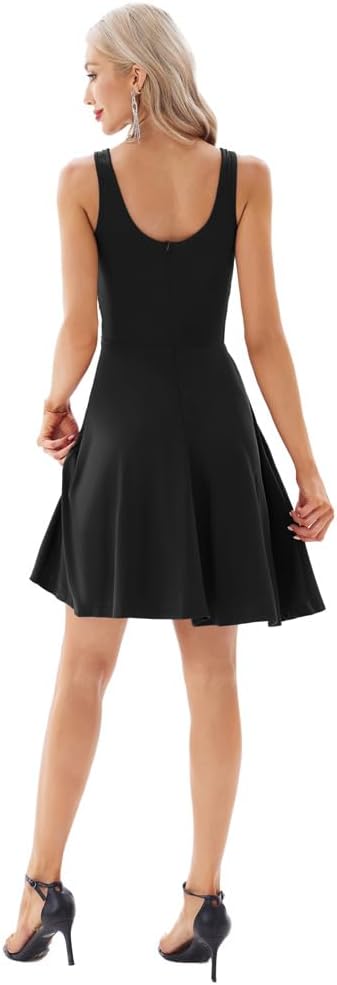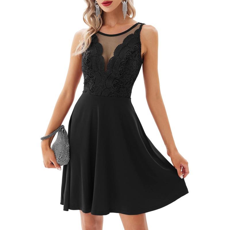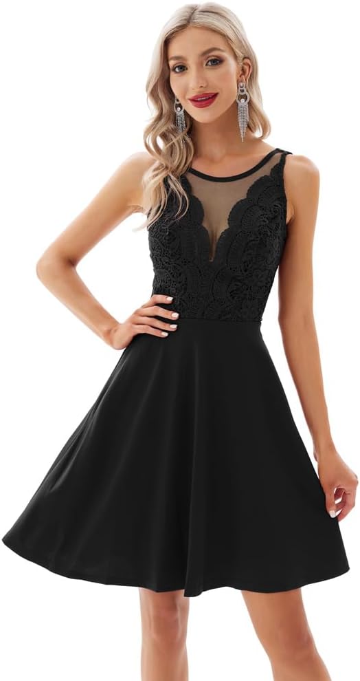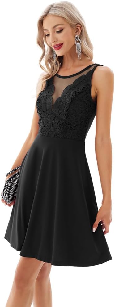 GRACE KARIN Women Sleeveless Lace Patchwork Deep V-Neck A Line Flared Party Dress(Black)