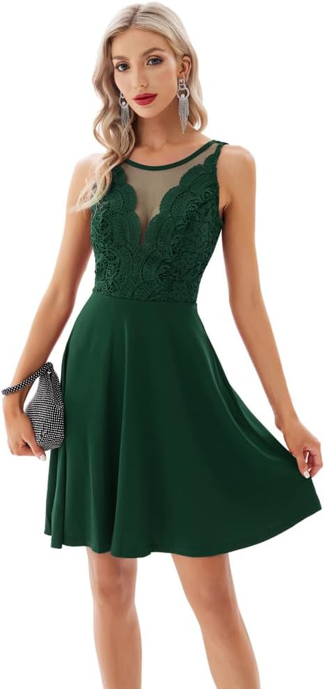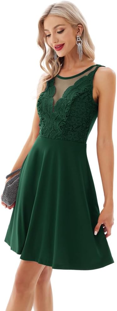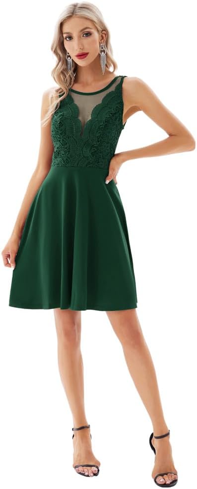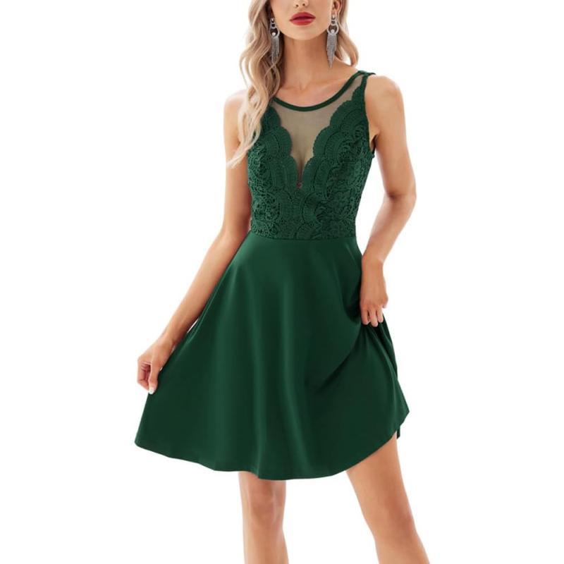 GRACE KARIN Women Sleeveless Lace Patchwork Deep VNeck A Line Flared Party DressGreen