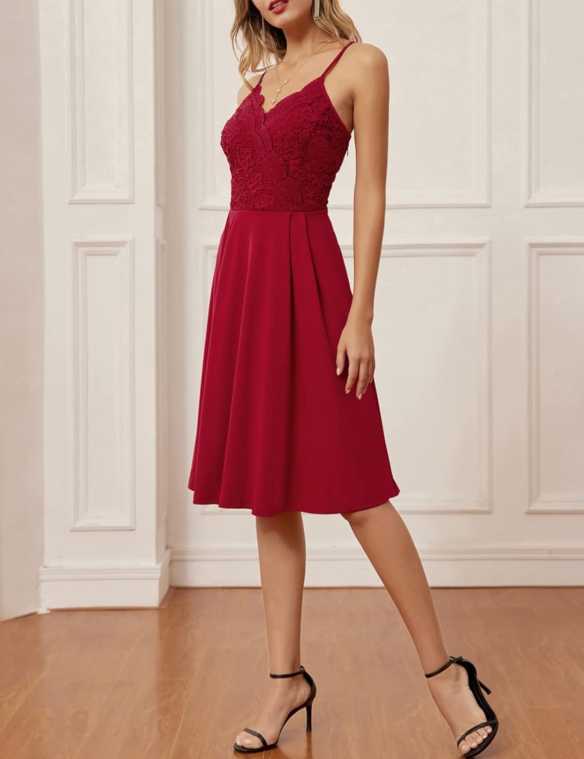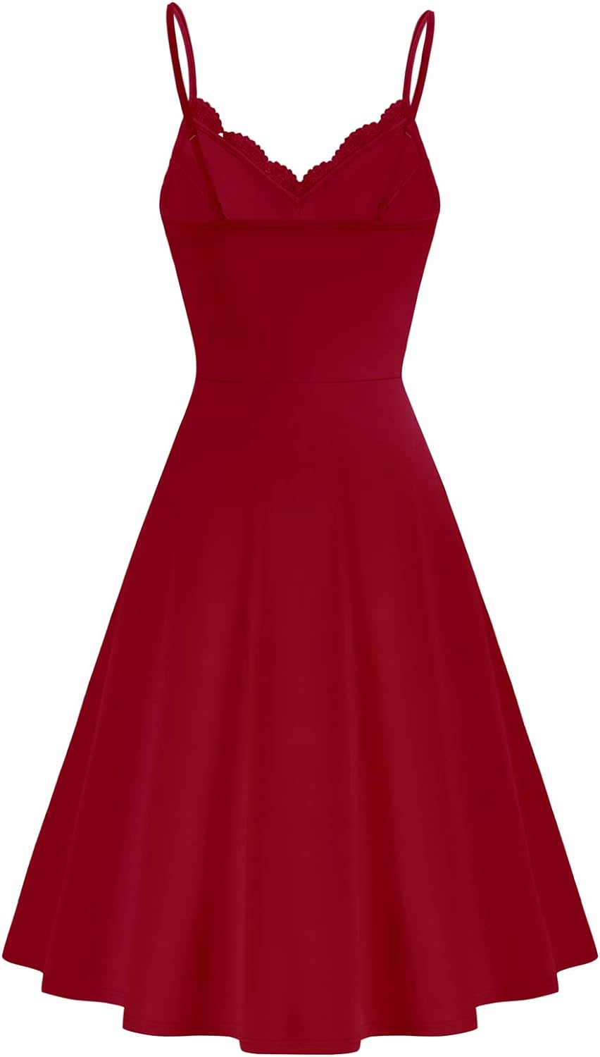 GRACE KARIN Women Sleeveless Lace Patchwork Deep V-Neck A Line Flared Party Dress(Red(sleeveless))