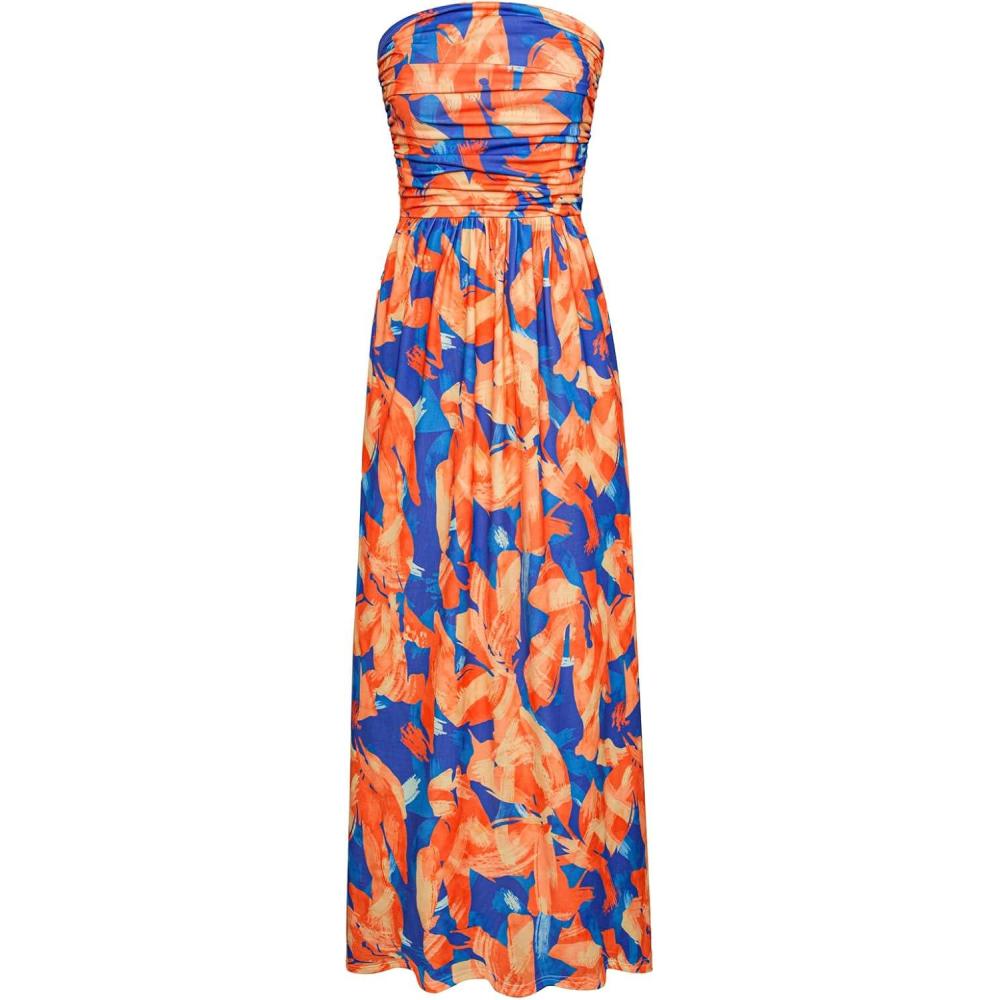 GRACE KARIN Women Strapless Casual Loose Ruched Long Maxi Dress with Pockets(Blue Orange Flower)