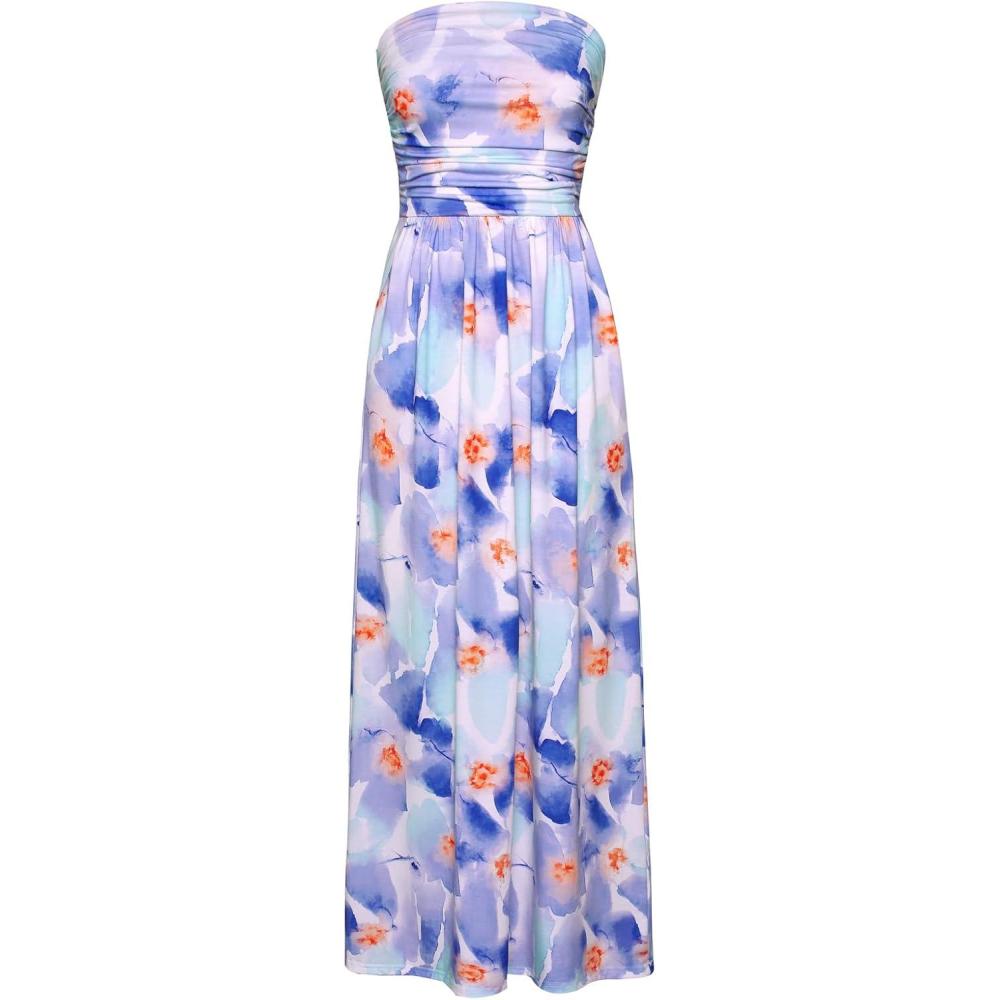 GRACE KARIN Women Strapless Casual Loose Ruched Long Maxi Dress with Pockets(Blue Purple Floral)