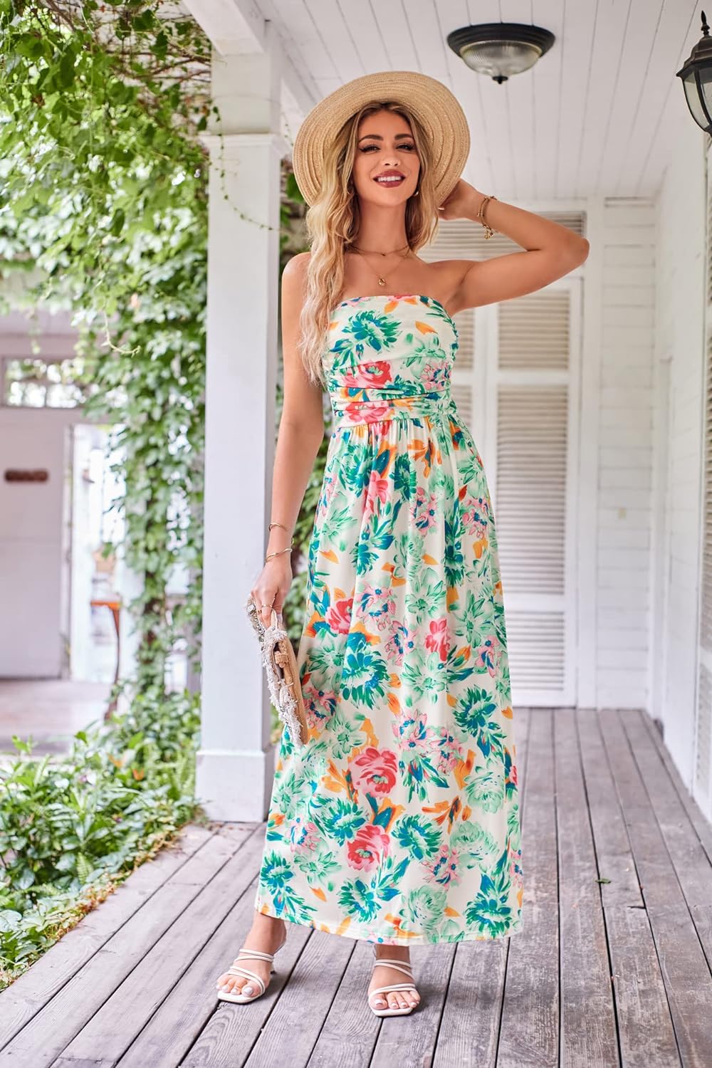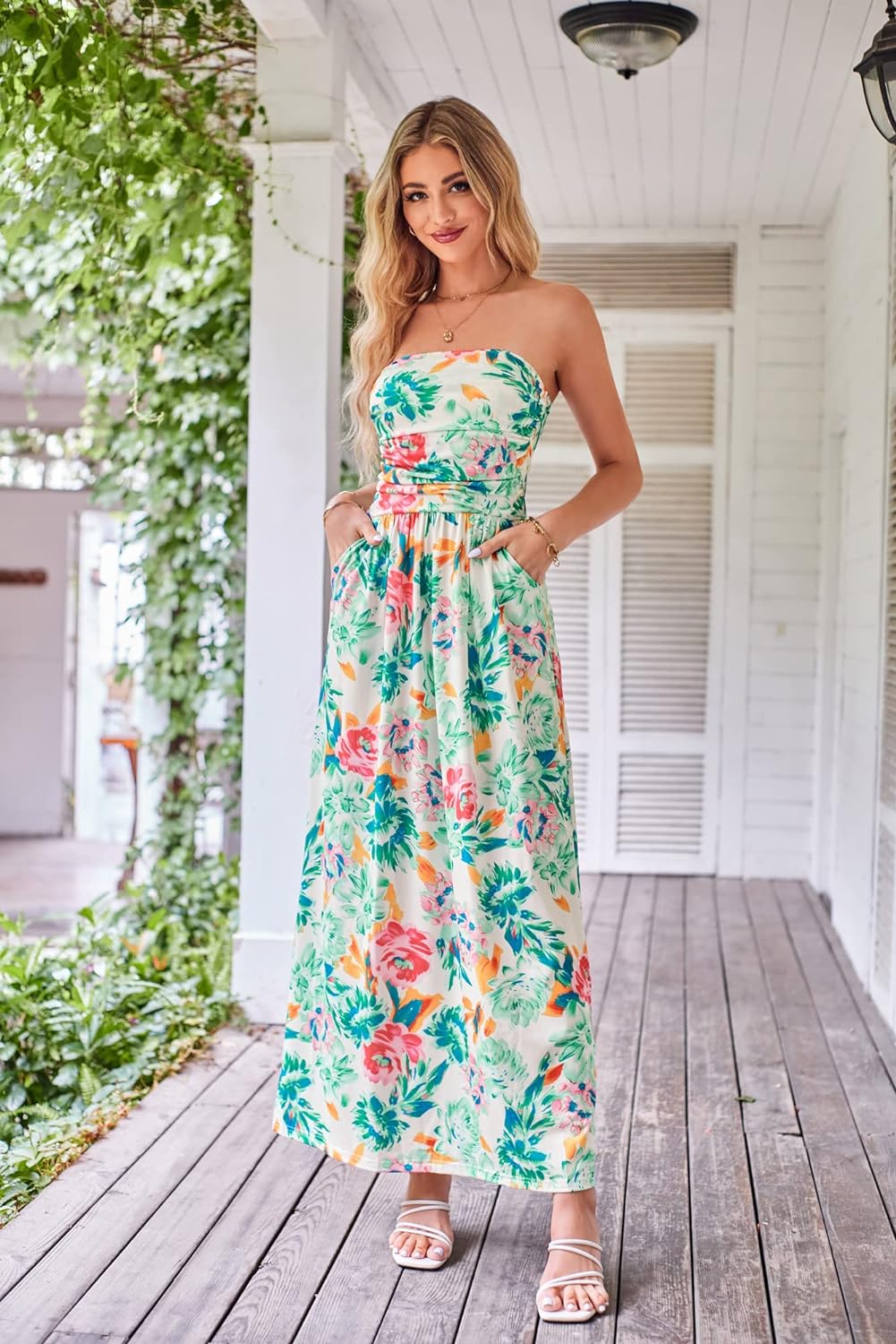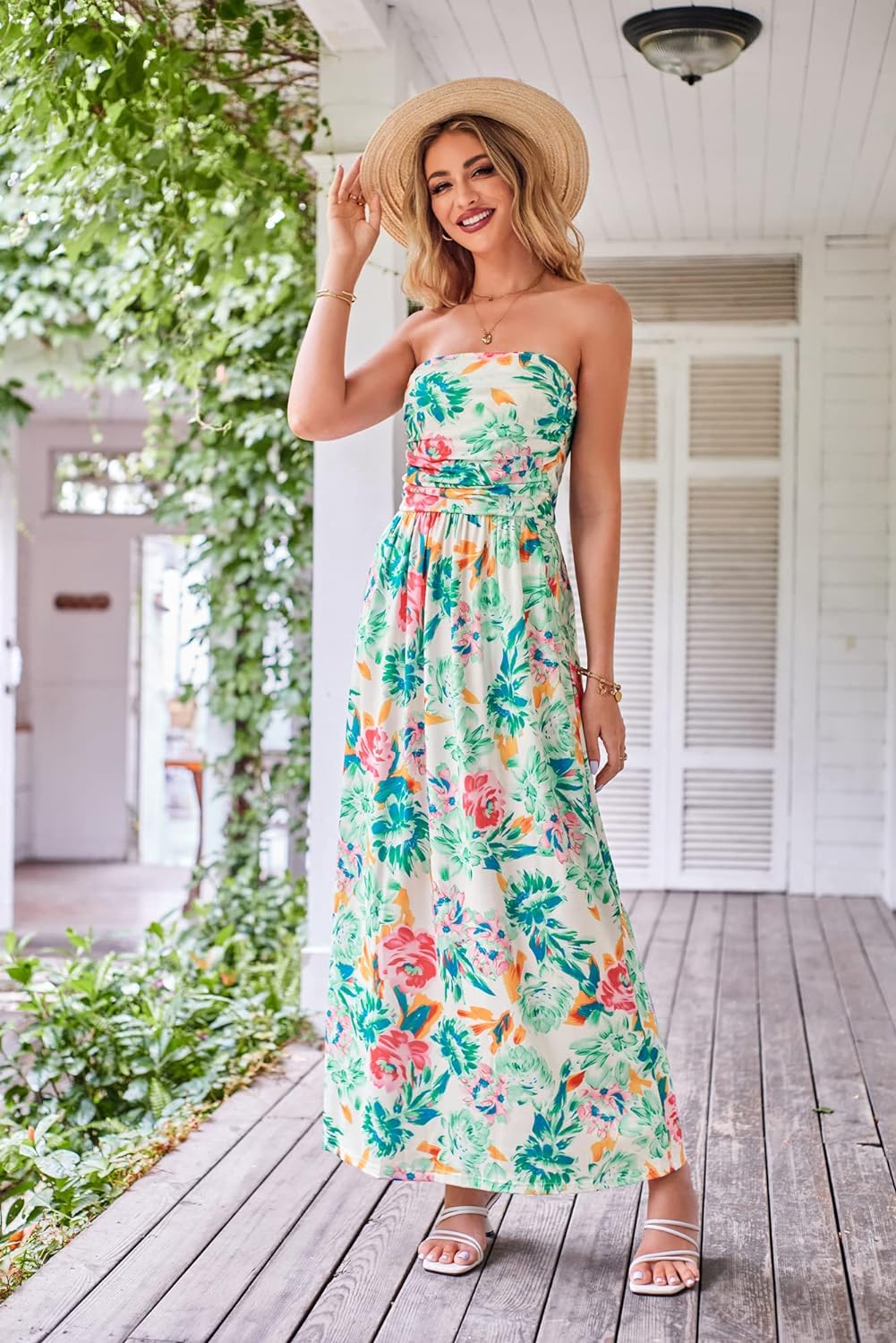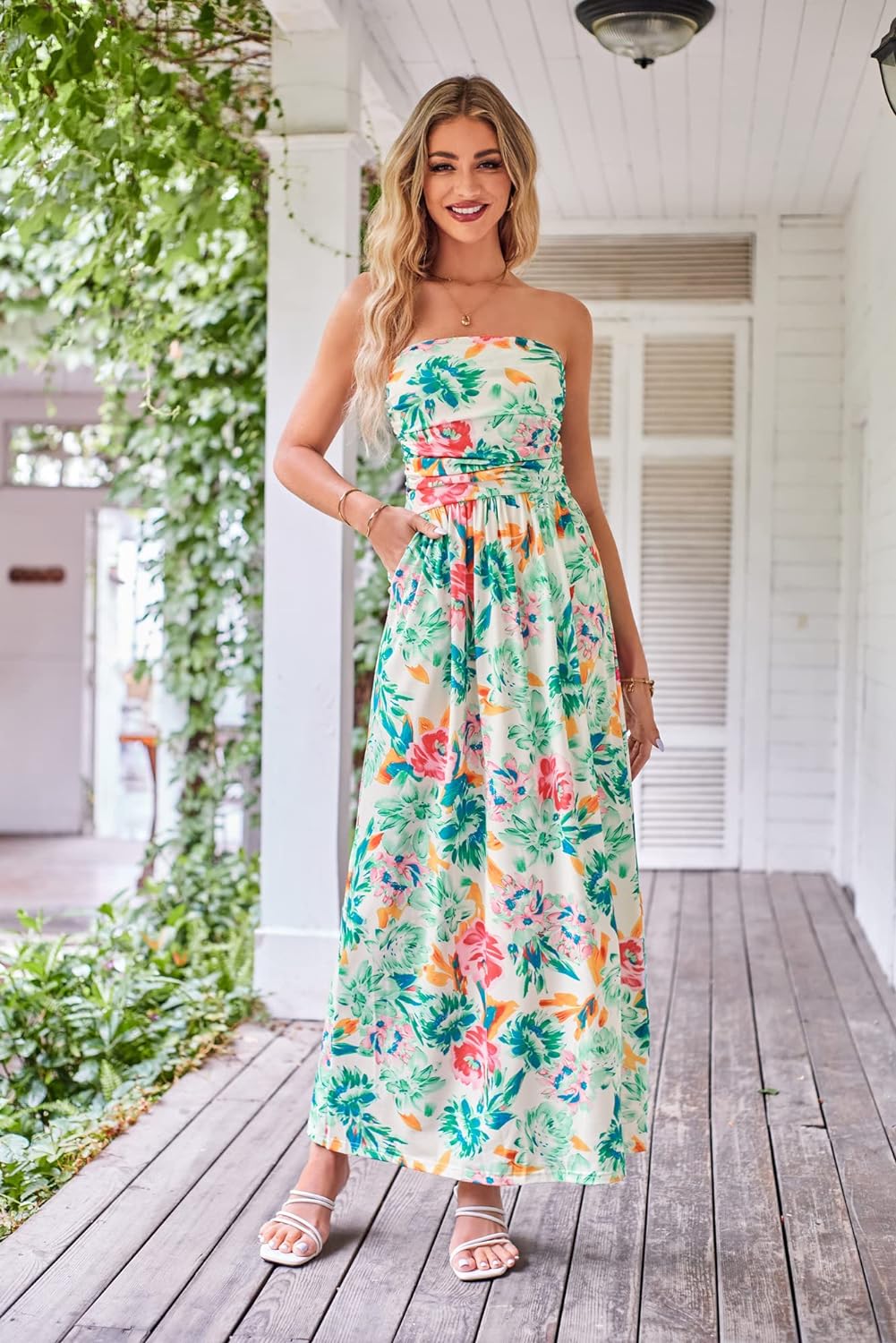 GRACE KARIN Women Strapless Casual Loose Ruched Long Maxi Dress with PocketsGreen Floral
