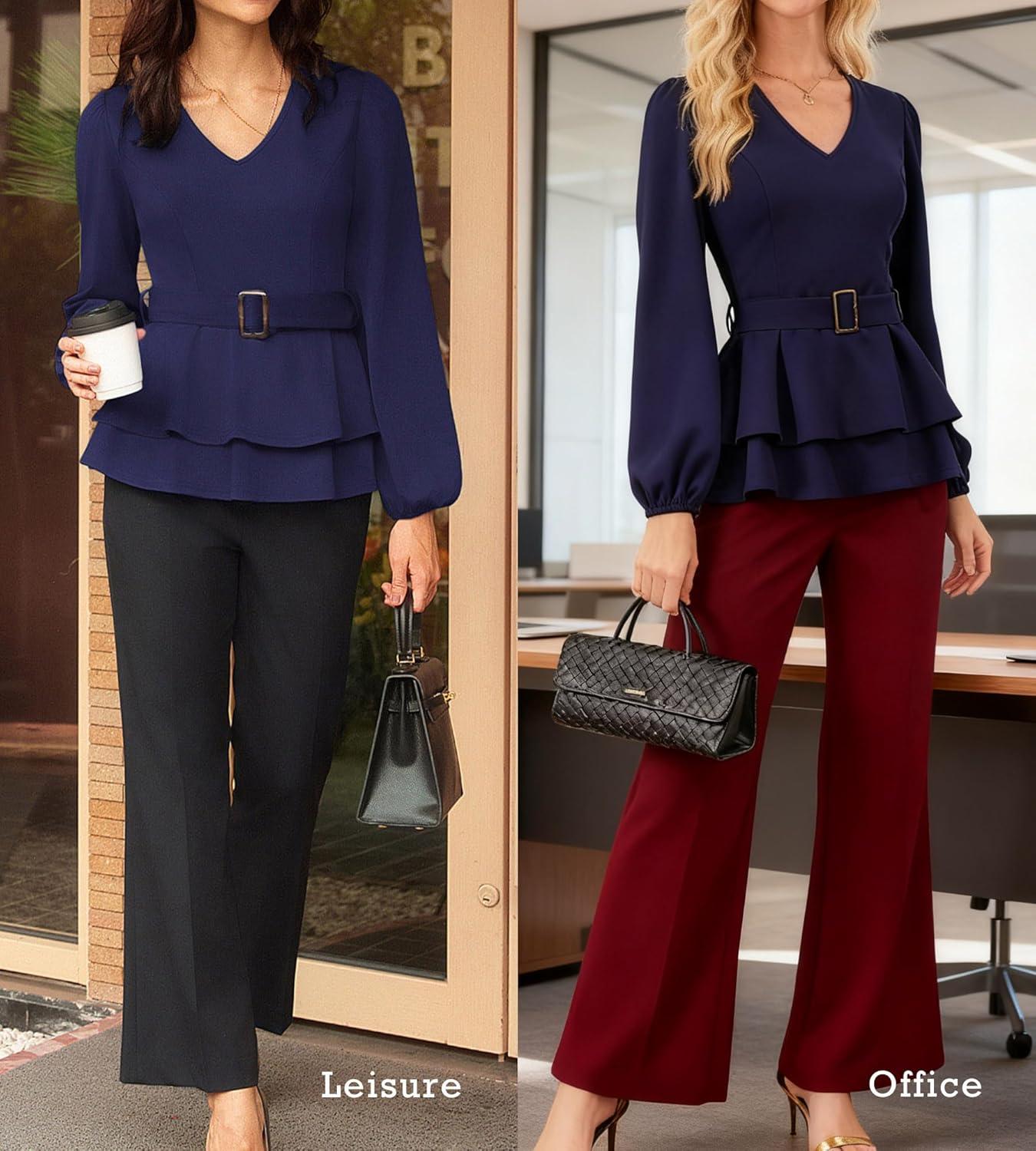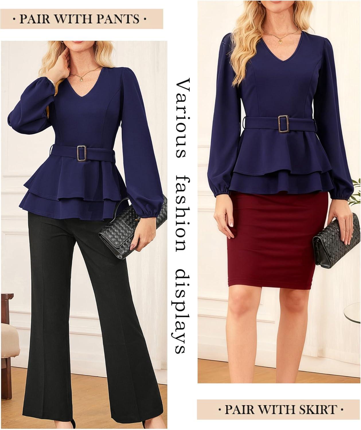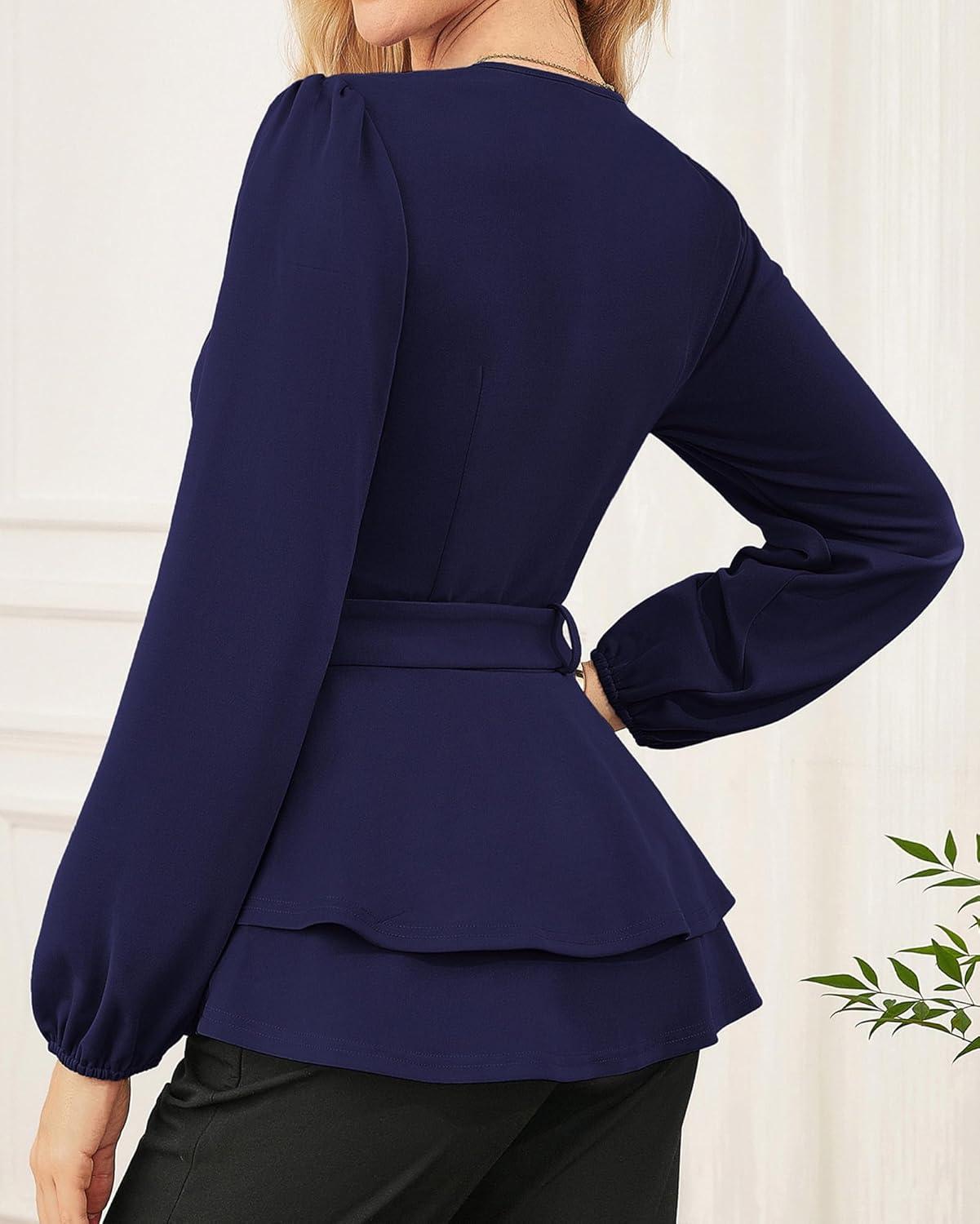 GRACE KARIN Women Work Peplum Tops,Long Sleeve Dressy Casual Blouses,V Neck Business Shirt Fall Outfits with Belt(Dark Blue)