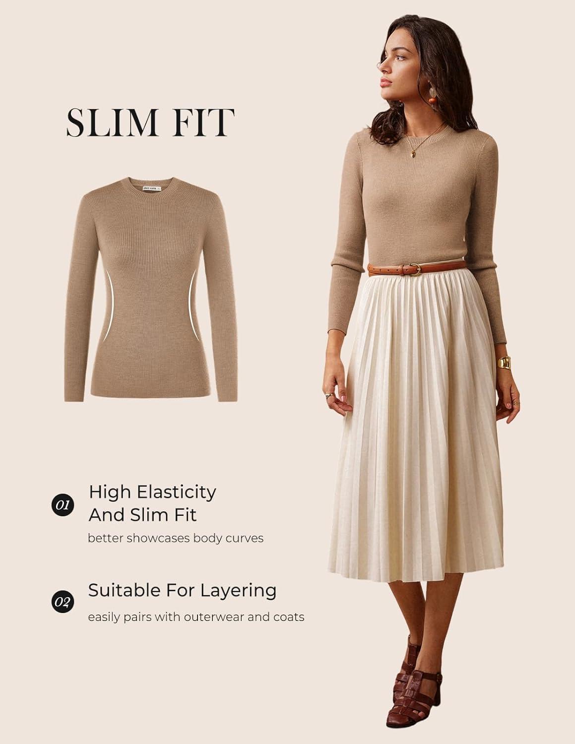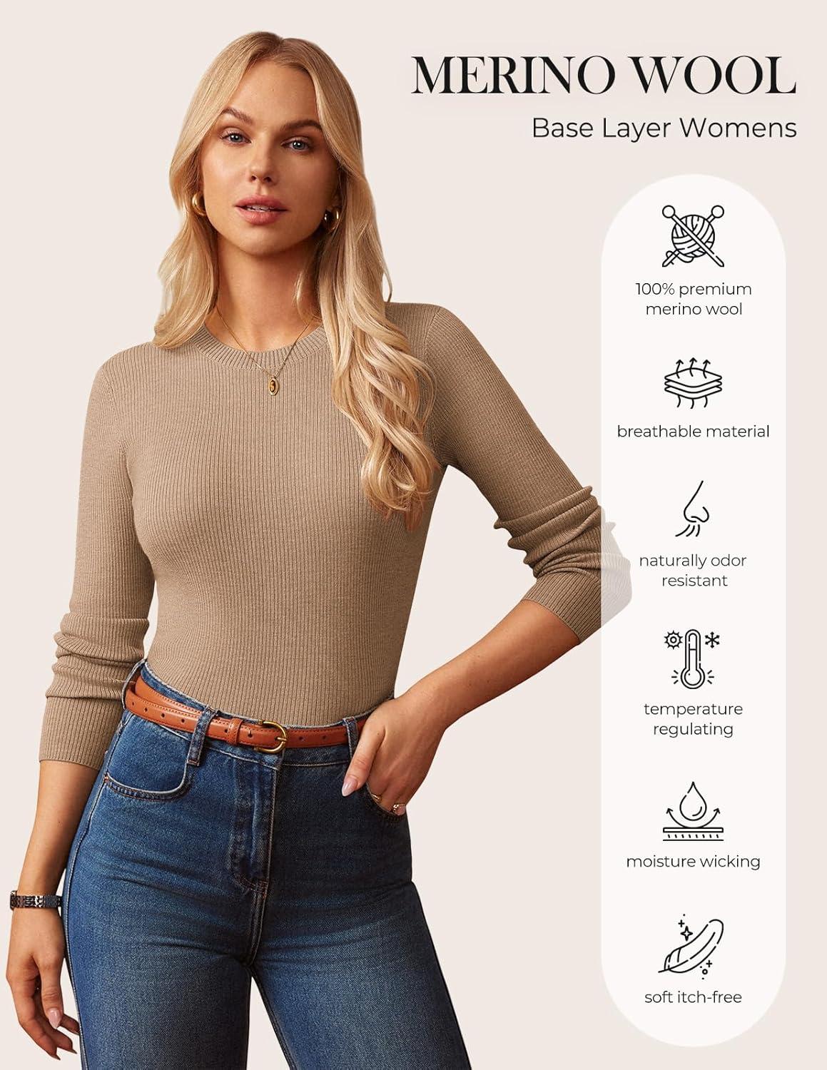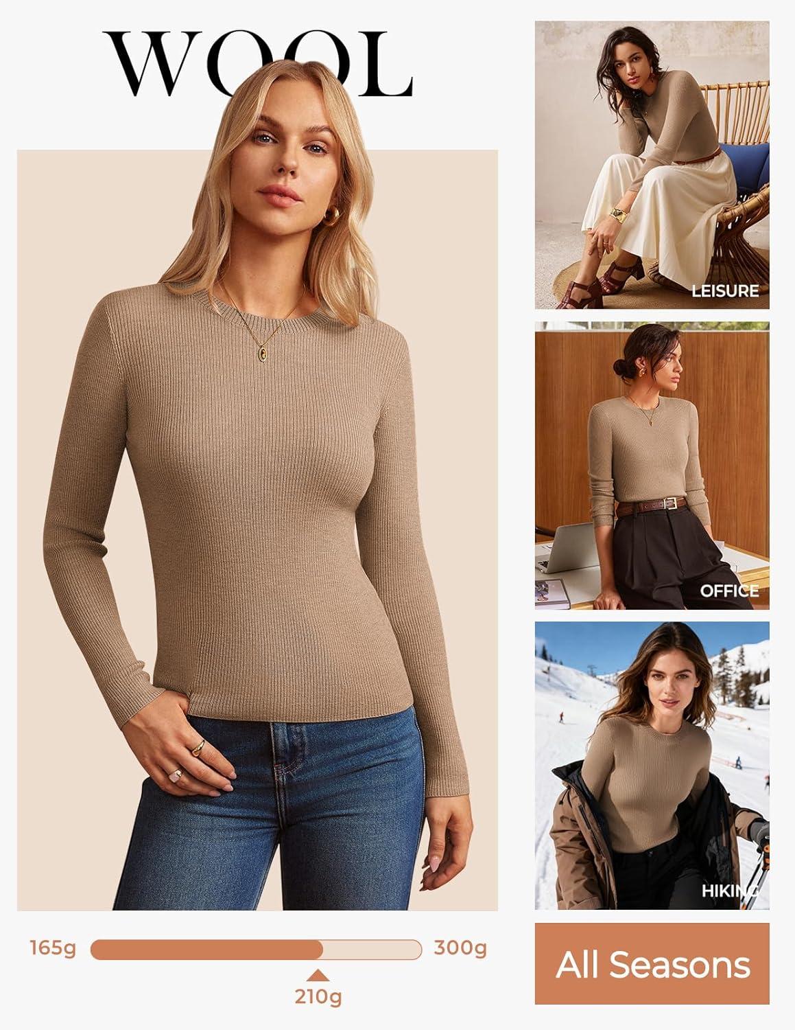imageGRACE KARIN Womens 100 Merino Wool Base Layer Sweater Fall Knit Long Sleeve Pullover Top Casual Soft Slim Fit ShirtCamel