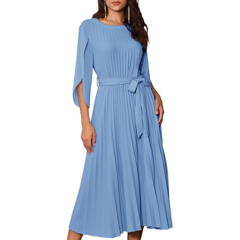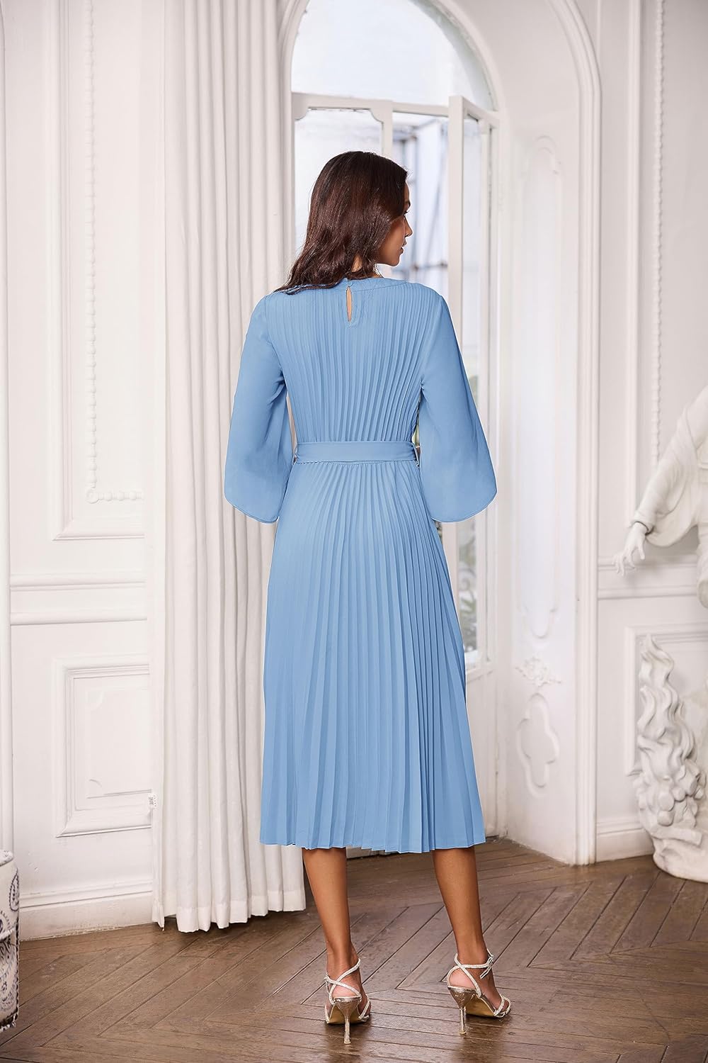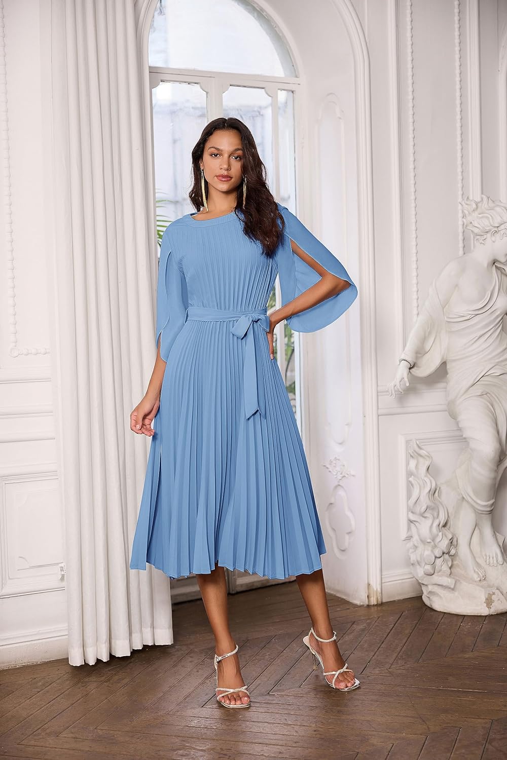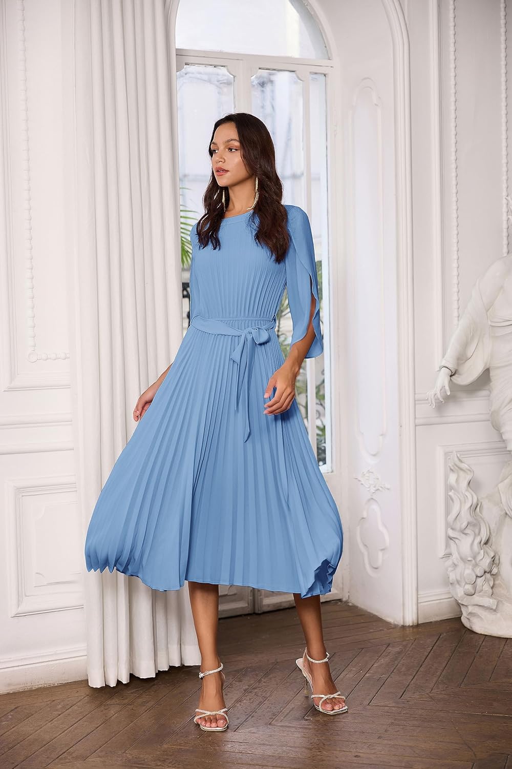 GRACE KARIN Women’s 2023 Pleated Chiffon Flowy Dresses for Wedding Casual Midi Ruffle Dress(Blue Gray)