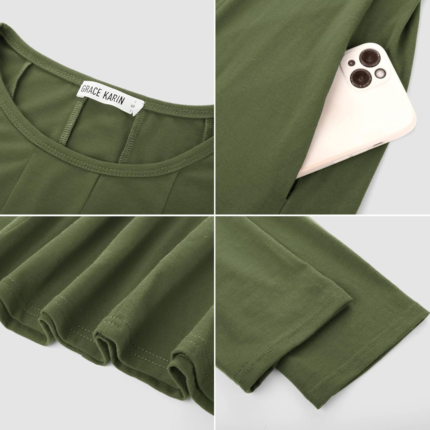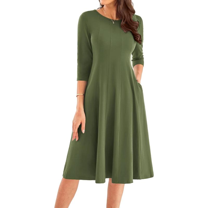 GRACE KARIN Womens 2024 Fall Trendy Crew Neck 3/4 Sleeve A Line Flowy Casual Midi Dress with Pockets(Army Green)